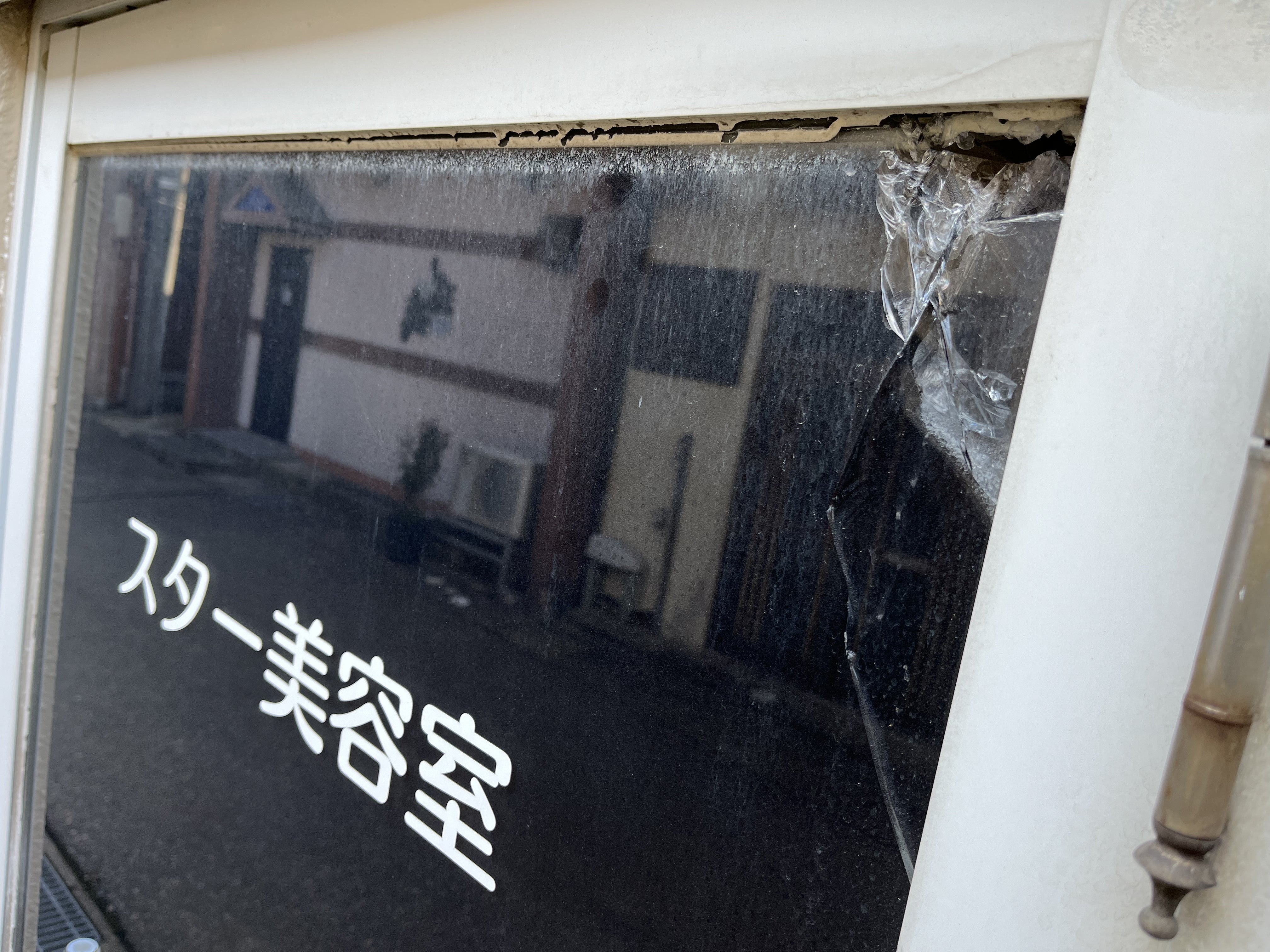 なんとか立ってはいるものの、傾いているようで、自力ではドアを開ける事はできませんでした。外壁、窓ガラスが割れ、店内も破損し物が散乱していました。