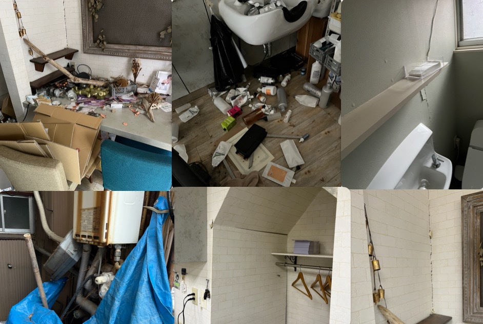 いつ倒壊してくるか分からないこの場所での営業再開は難しく、今は七尾市内の店舗を間借りして少しづつ営業をしています。七尾市内は現在も断水が続いていて、通常営業は出来ておらず、1日も早くお客様に安心して美容の場を提供したいと願っております。