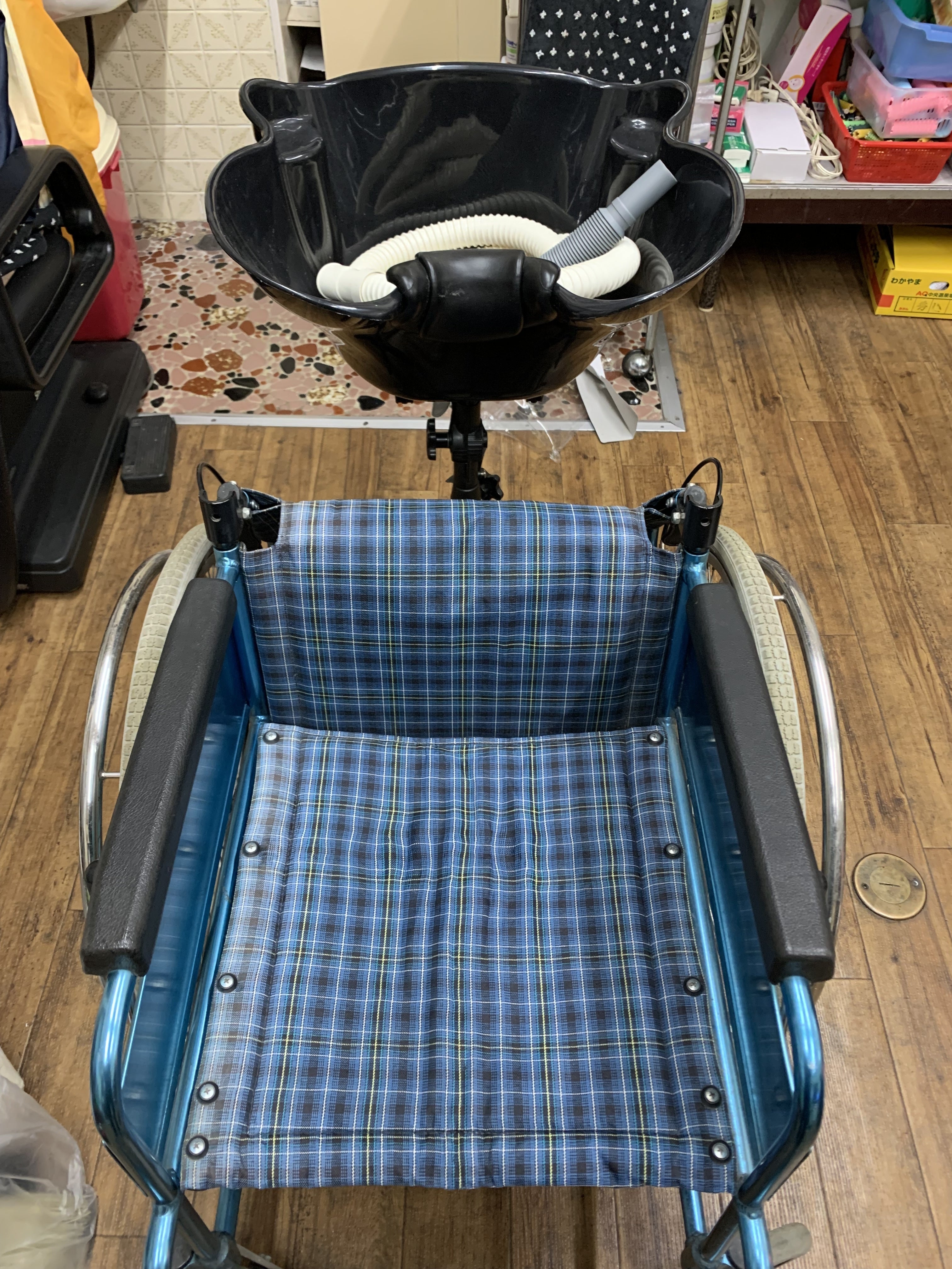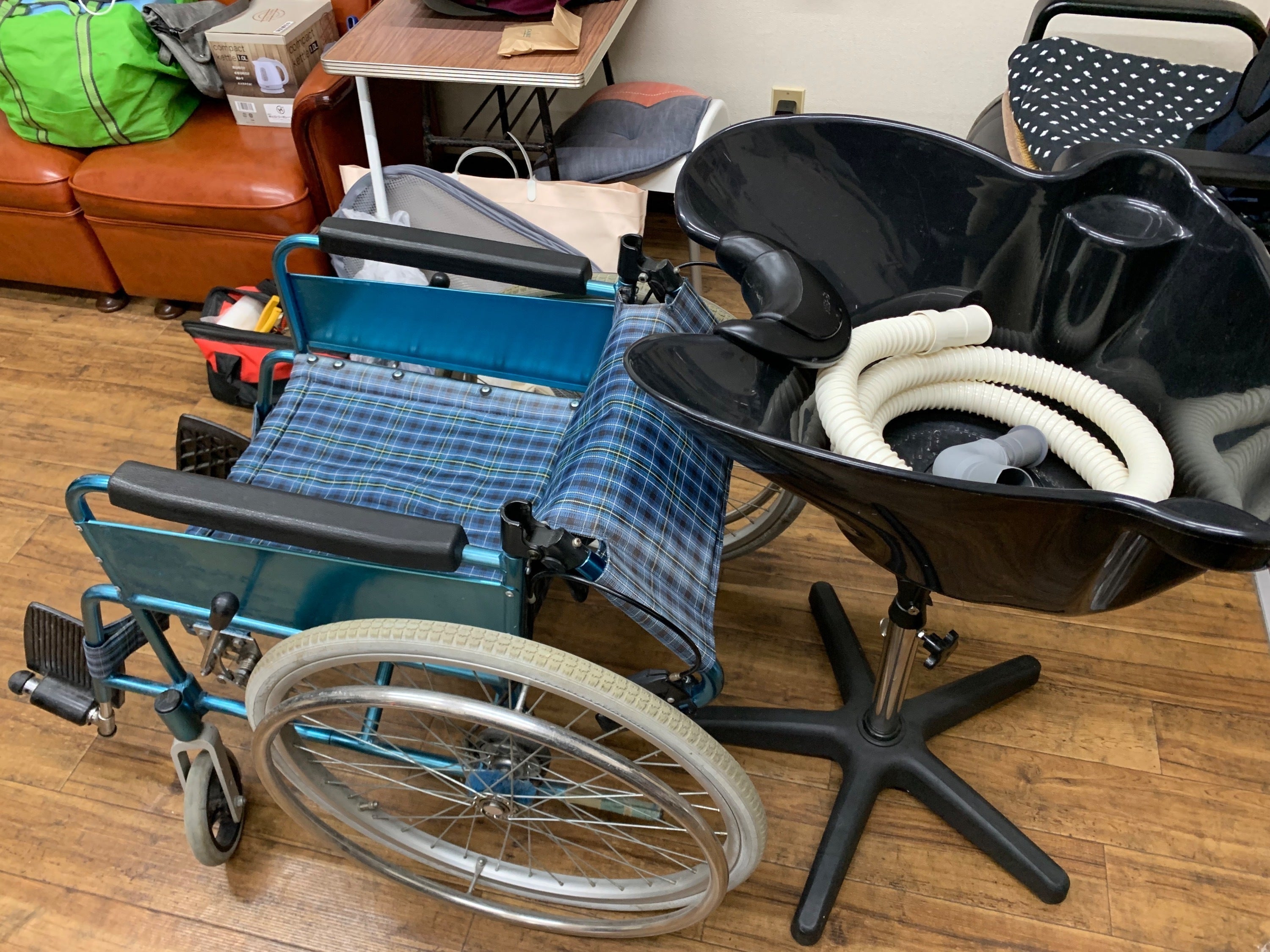 携帯シャンプーボウルと車椅子