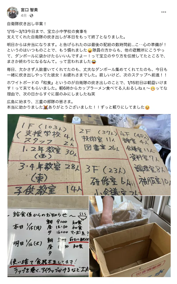 私たち「炊き出し隊」と一緒に本プロジェクトを立ち上げた珠洲市の宮口智美さんの投稿をシェアさせていただきます。宮口さん、いつもありがとうございます