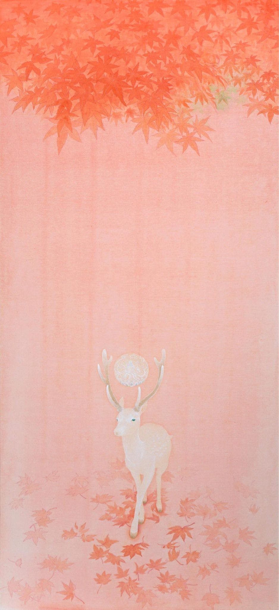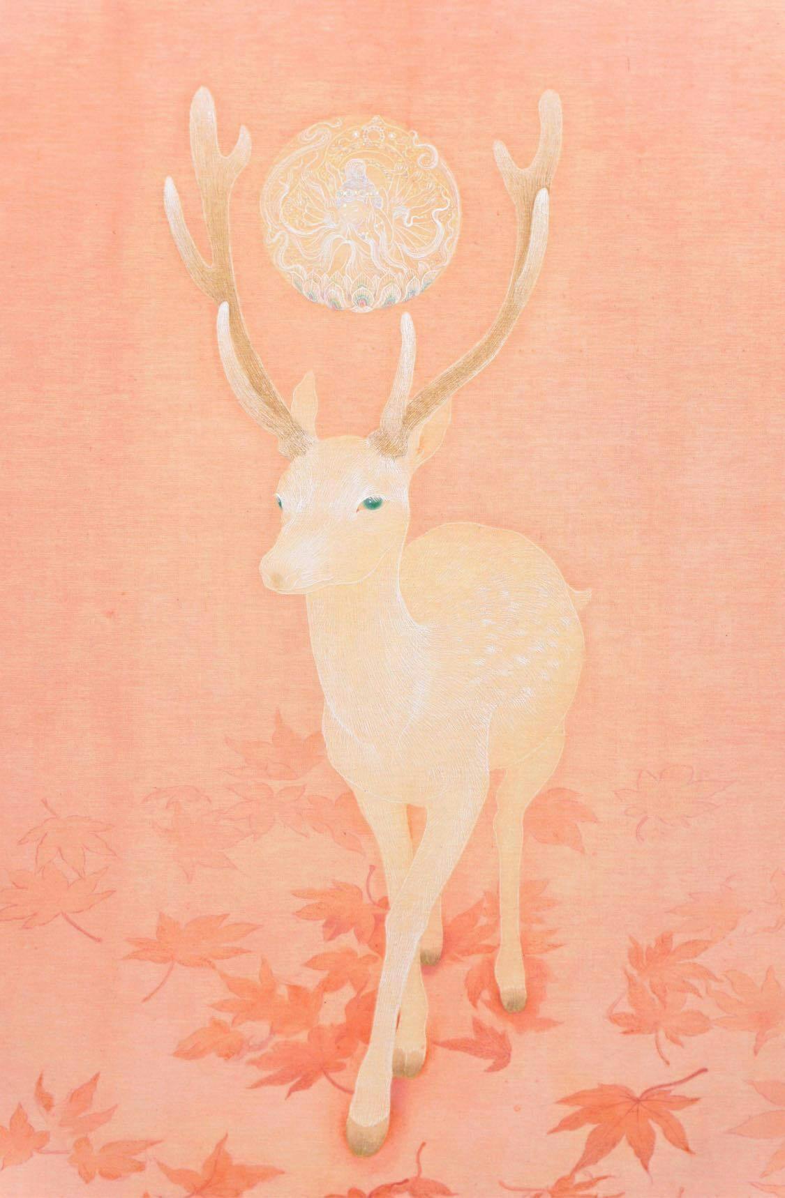 画家・谷中美佳子さんが描いたのは、尾張最古の寺院と伝わる愛知県犬山市の「継鹿尾山寂光院」に伝わる「寂光院縁起」をテーマにした作品。聖なる鹿の頭の上にかがやく玉は、なんとヤマトタケルノミコトの魂なのです。
