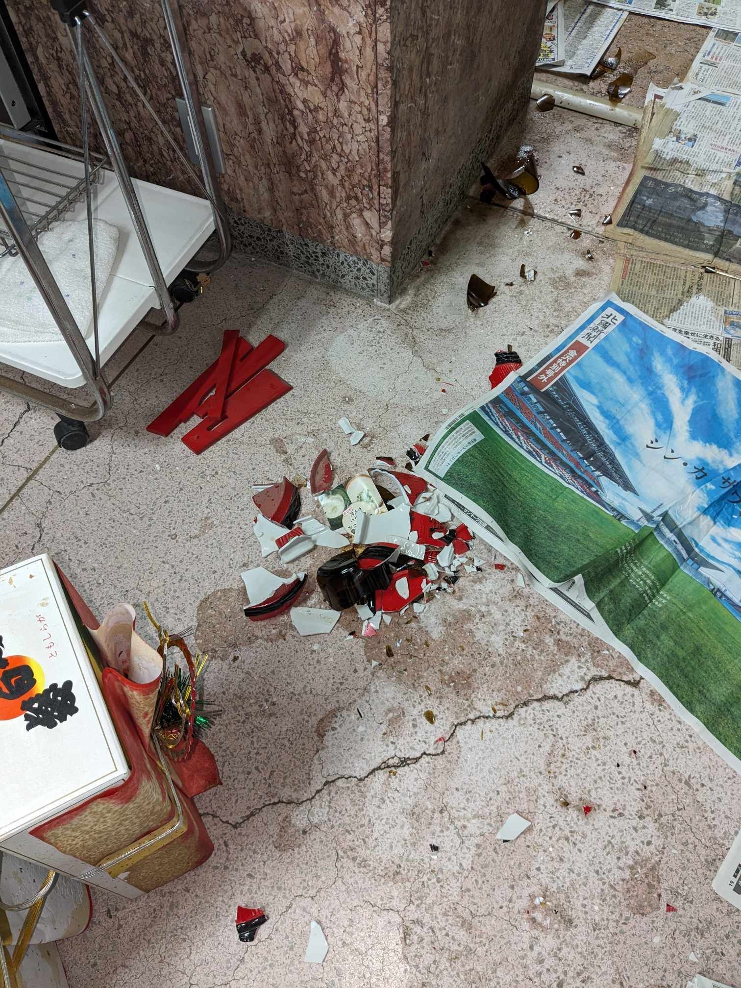 売り場の床には割れた酒瓶が飛び散り、地面は割れてしまっています。