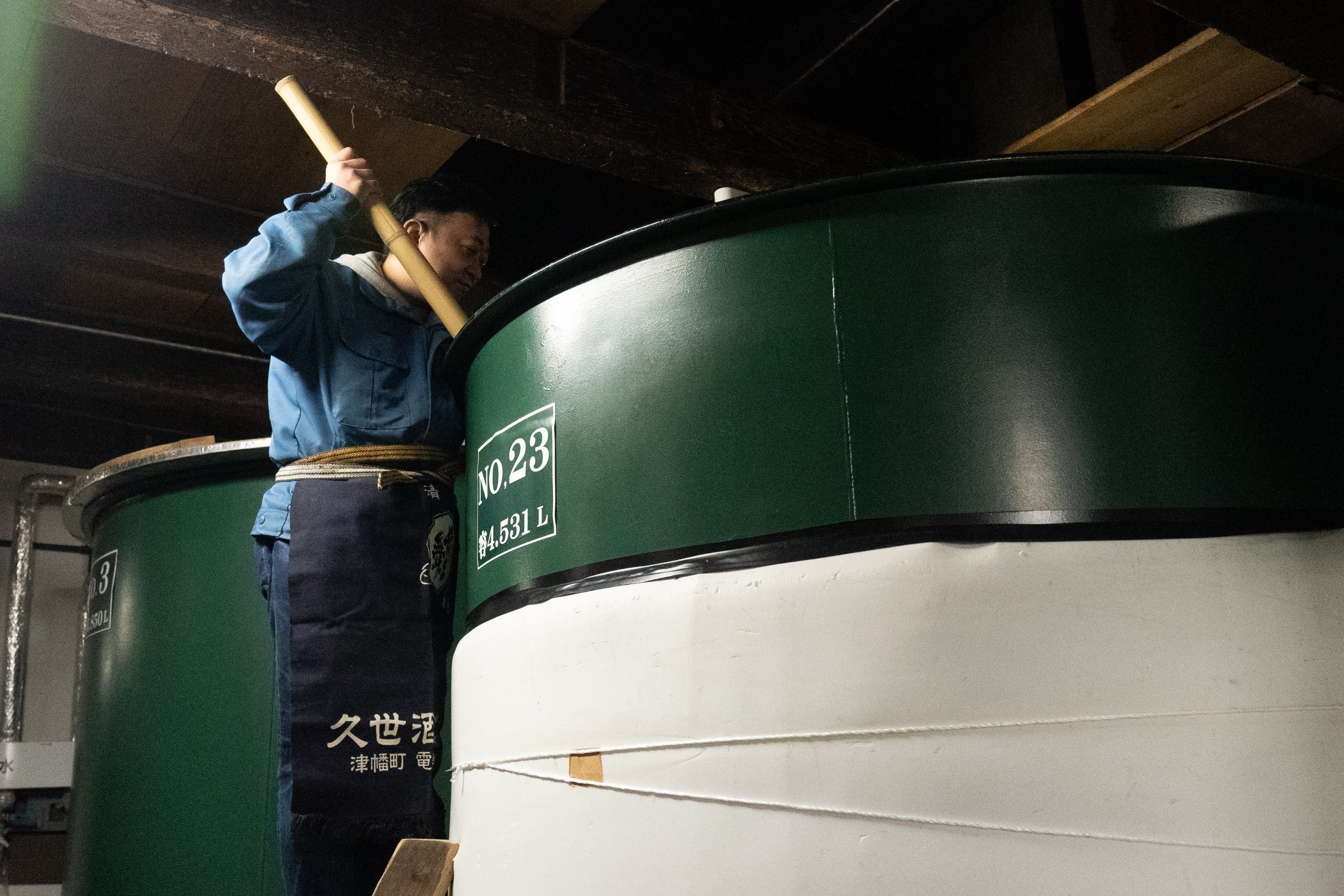 お酒は大きなタンクで発酵させます。久世酒造店では5000リットルから10000リットルのタンクを使用しております。しかし、お客様の求めるお酒も多様化してきており、久世酒造店でも現在の大きなタンクも使いながら、小型のタンクを用いて新しいお酒の研究もしていきたいと考えています。