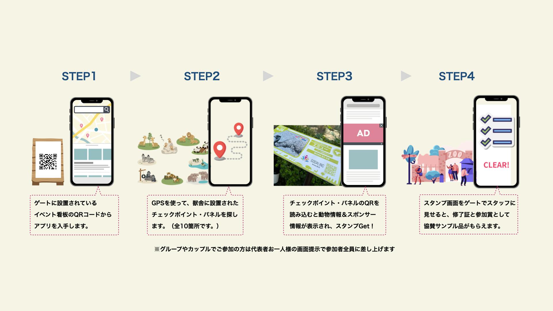 デジタルスタンプラリーは、スマートフォンやタブレットなどのデジタル端末を使って参加するスタンプラリーです。GPS機能で園内の獣舎に設置された動物スポットを探して集める、天王寺動物園全体を使ったダイナミックなイベントです。
