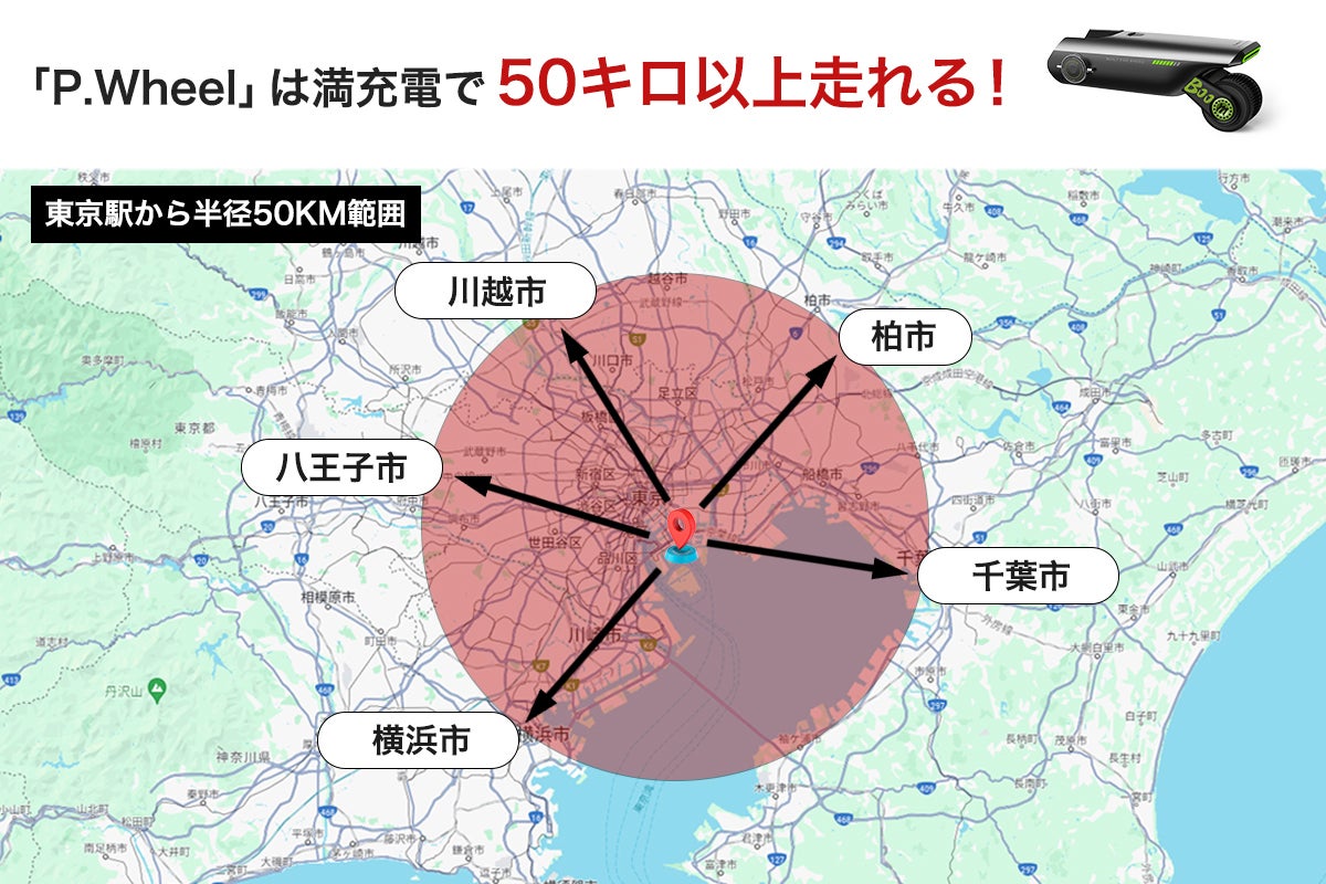 「P.Wheel」を使用して東京駅から出発すれば、約50km離れたところを気楽に到着できます。これにより、ほとんどの使用シーンに対応することができ、より便利なサイクリングが楽しめます。