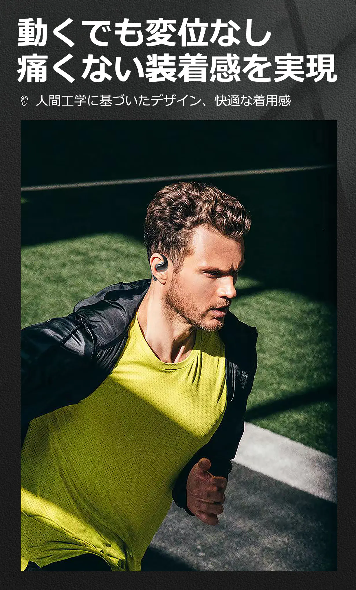 人間工学に基づいたデザインと、イヤホンが落ちやすいという欠点を組み合わせて、外れにくいの外形を設計しました。