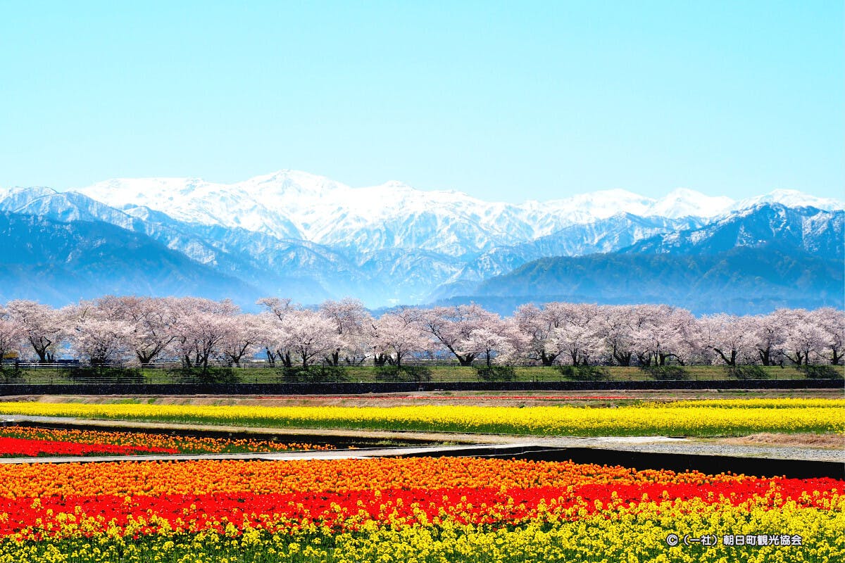 富山県朝日町、あさひ舟川「春の四重奏」、残雪の朝日岳を背景に、桜並木、チューリップ、菜の花が奏でる四重奏! 今回のリターン(返礼品)のクリアファイルの写真の場所です!