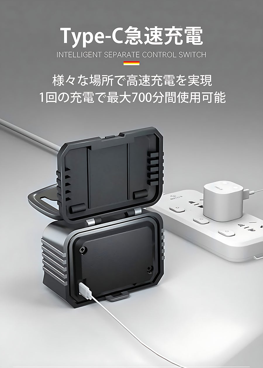 Type-Cの急速充電に対応しており、5時間の充電で最大700分間使用できます。