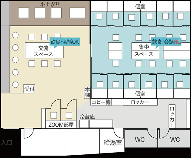 飲食や会話ができるスペース。ここにいる方なら話しかけてもOK。「一緒にがんばる仲間がほしい」方は、ぜひ交流スペースをご活用ください。打ち合わせ利用もおすすめです。