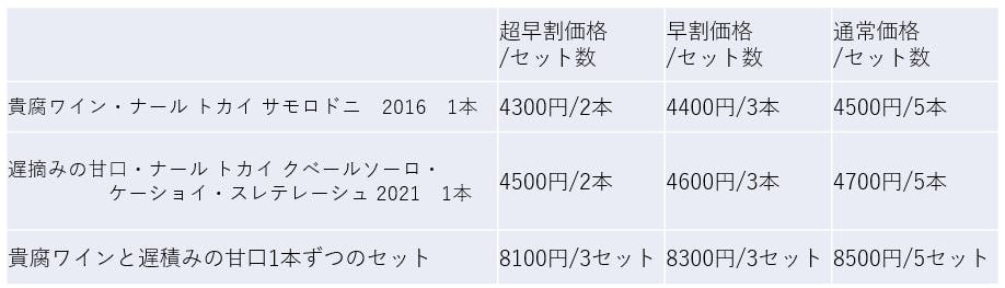リターンは辛口白ワインの3本セットと樽厳選辛口白ワインの2本セット、すべて1本ずつの5本セットをご用意し、早割も各5つ限定で作っています。