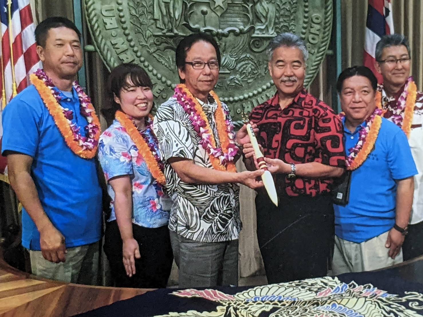 2016年ハワイと嘉手納町の交流会でハワイの沖縄日系州知事に『アダン筆』を贈呈