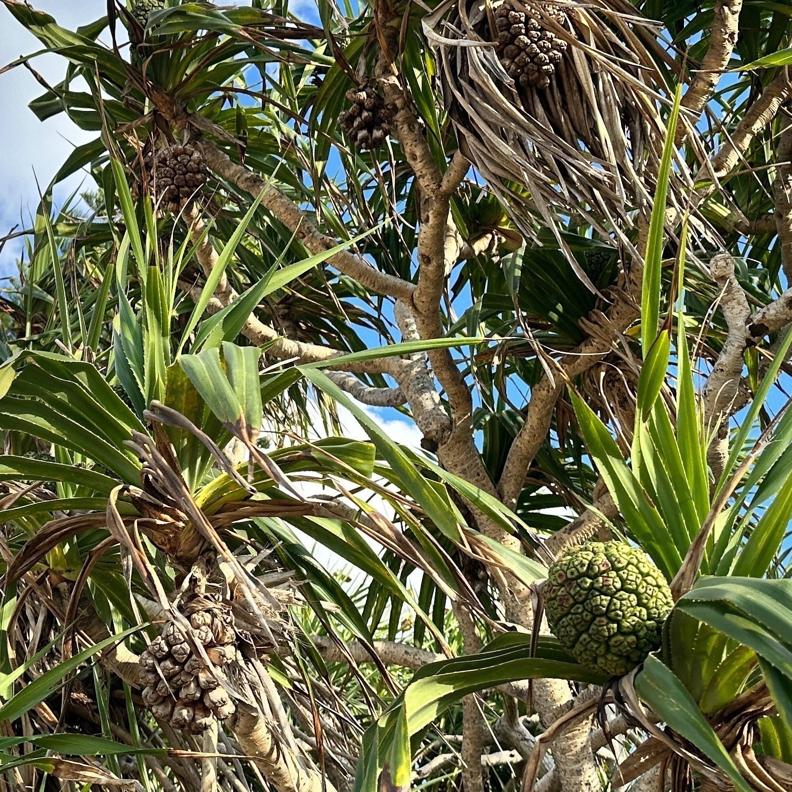 アダンは熱帯海岸に生える常緑の小さな木で、パイナップルのような果実をつけます。