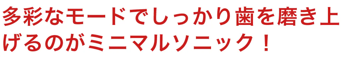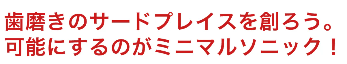 今までの電動歯ブラシを大きいと感じたことはありませんか?普通の歯ブラシから電動歯ブラシに変えた時にそれを大きく感じると思います。電動歯ブラシは構造上、大型化してしまうのですが、常識に囚われずまったく新しい電動歯ブラシを設計したのがこのミニマルソニックです。新発想の構造で小型でパワフル。未来の体験をはじめましょう。