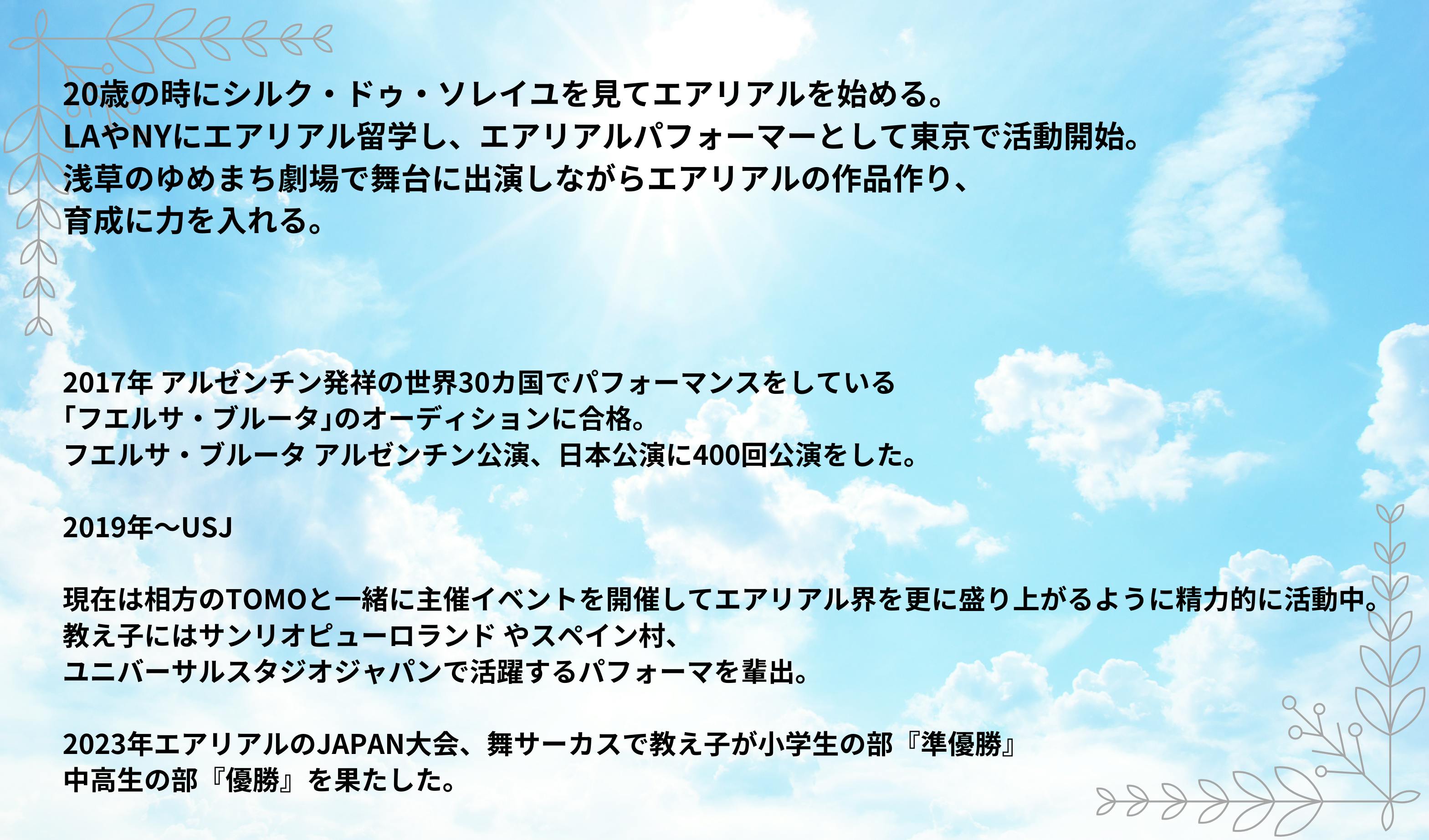 ※エアリアルとは、サーカスなどでおこなわれる空中パフォーマンスのことを指します。