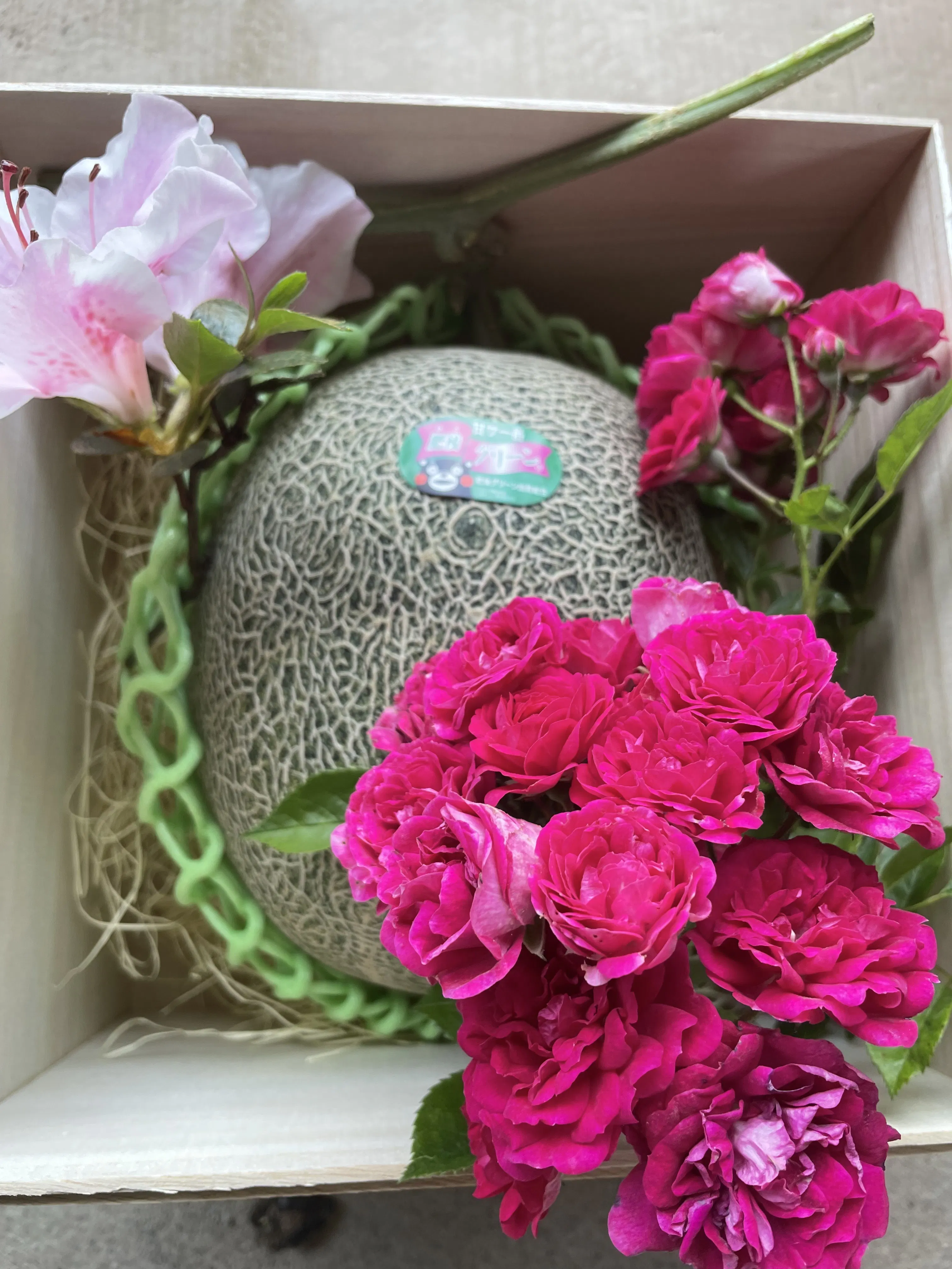 肥後グリーンメロン1玉を木箱に入れ、農場のバラを添えて発送させて頂きます