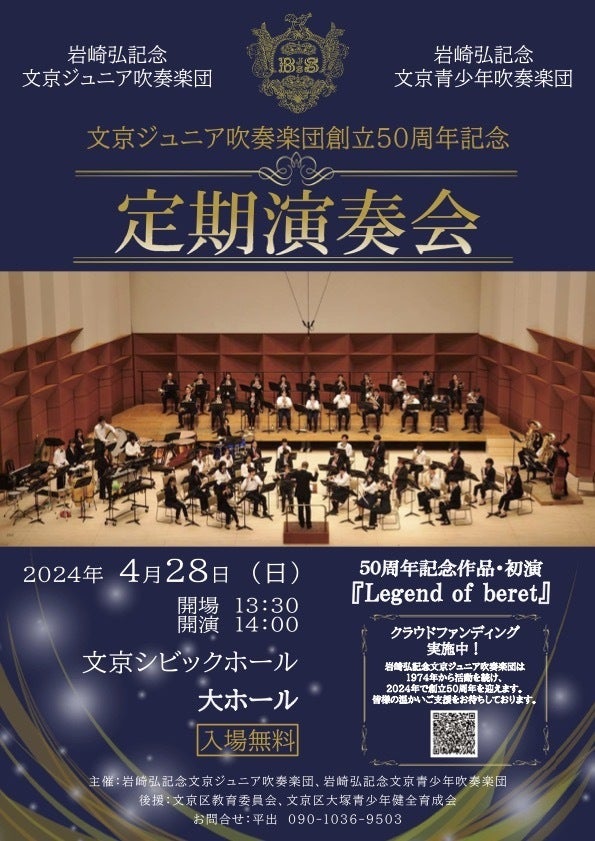 いつも活動をご支援いただき、ありがとうございます。創立50周年記念定期演奏会のフライヤーが完成しました。いよいよ本番まで2ヶ月を切りまして練習も本格化。50周年記念曲である「Legend of beret」も着々と仕上がってきています。ご期待ください!!岩崎弘記念文京ジュニア吹奏楽団へ入団ご希望の方はこちらまで。https://1974bjsbss.jp/recruit/bjs/引き続きよろしくお願いいします。