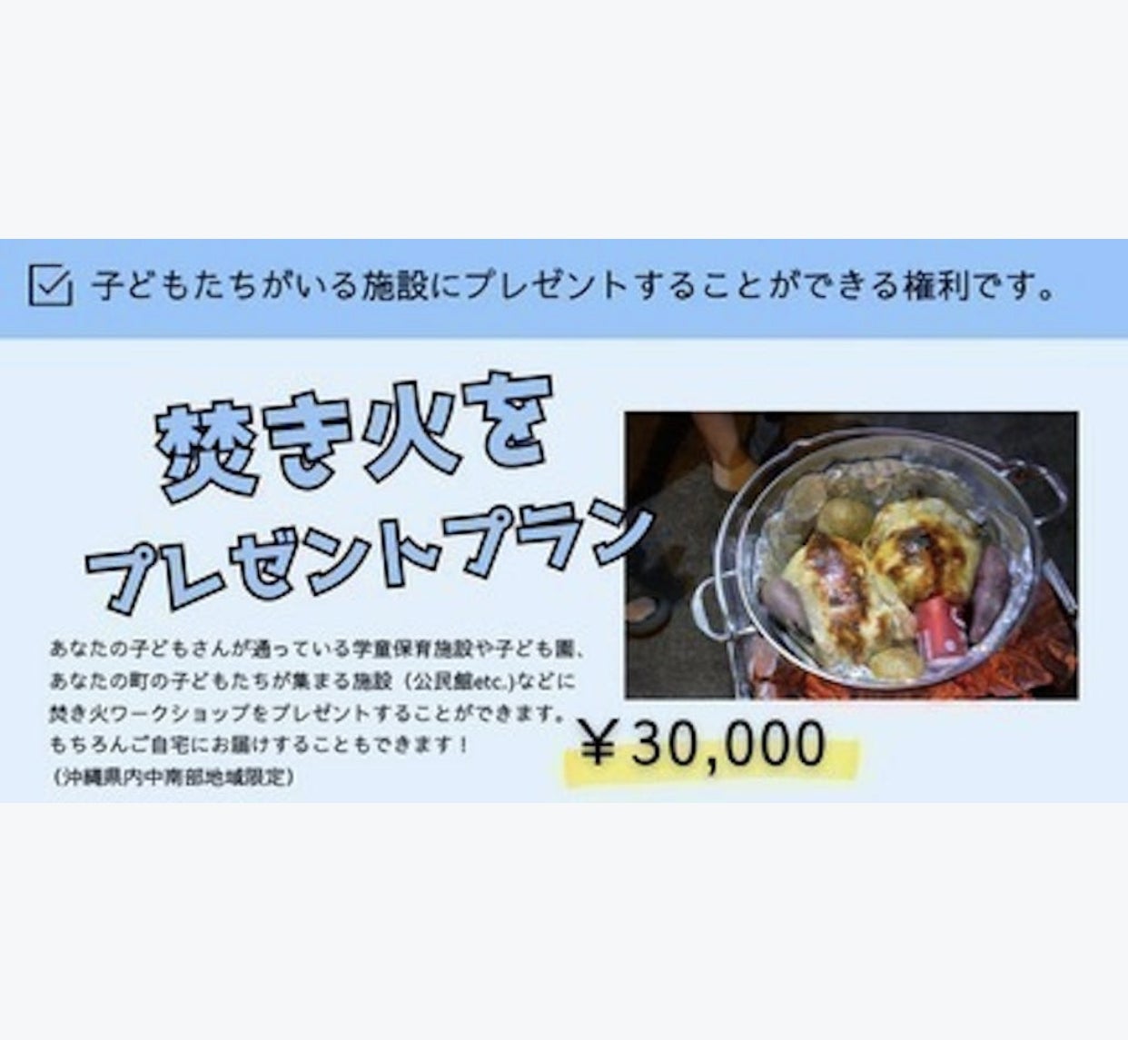 子どもたちがいる施設に、うっし〜が器材や食材を持ち込んで、火付けから子どもたちがやって火を育てて、ダッチオーブンで野菜とチキンの丸焼きつくり、食べるというワークショップをお届けするリターンです。