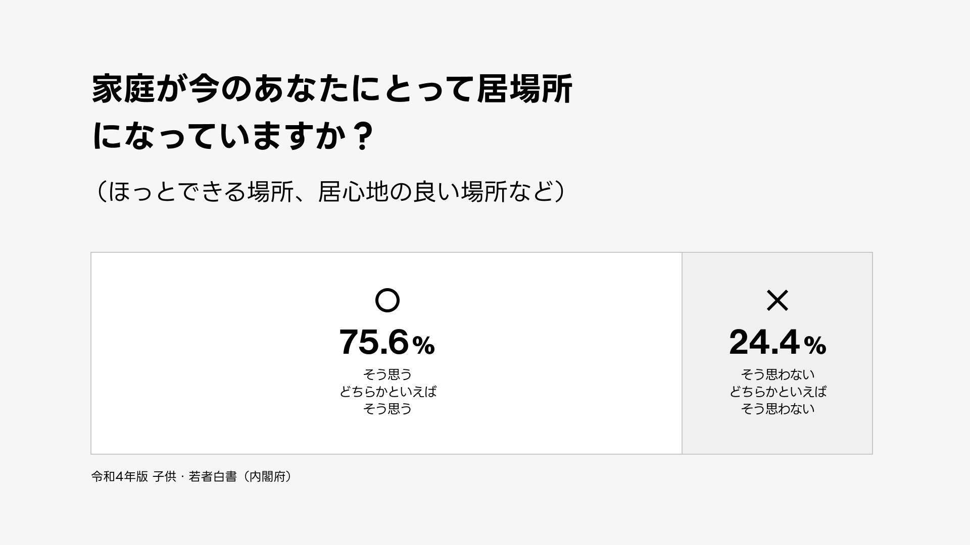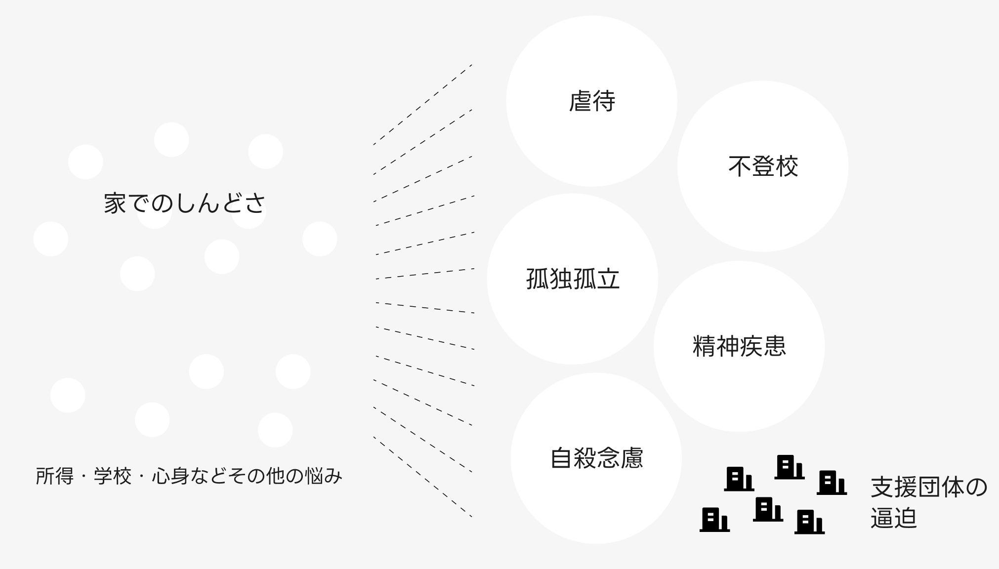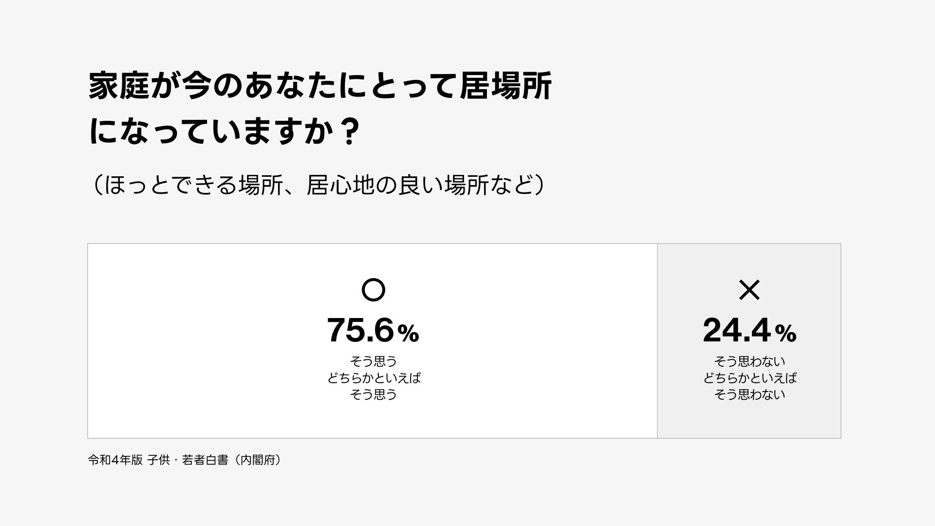 家でのしんどさから、自殺・不登校・精神疾患など様々な社会的課題につながるリスクは高いです。社会的課題は様々な要因が複合的に絡んで発生しますが、家でのしんどさは誰にでも起こりやすい要因の一つと考えています。