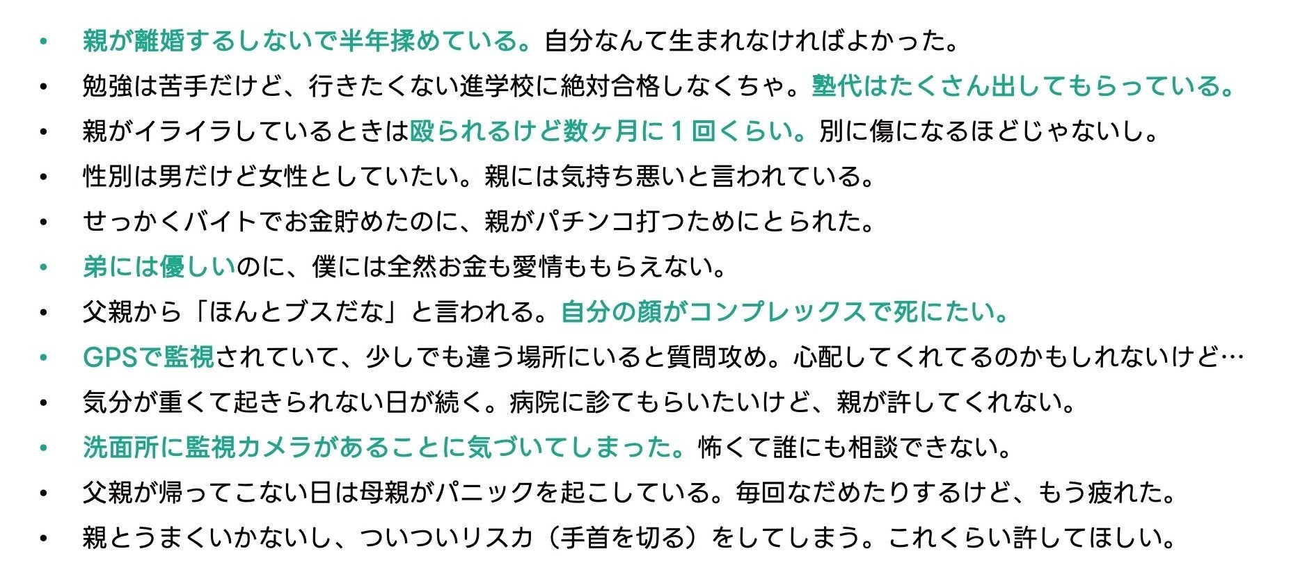 これらは実際に寄せられた声です。虐待として保護されるほどでもないものの、しんどさを感じる状態にある少年少女が多くいます。(個人が特定されないよう加工しています)