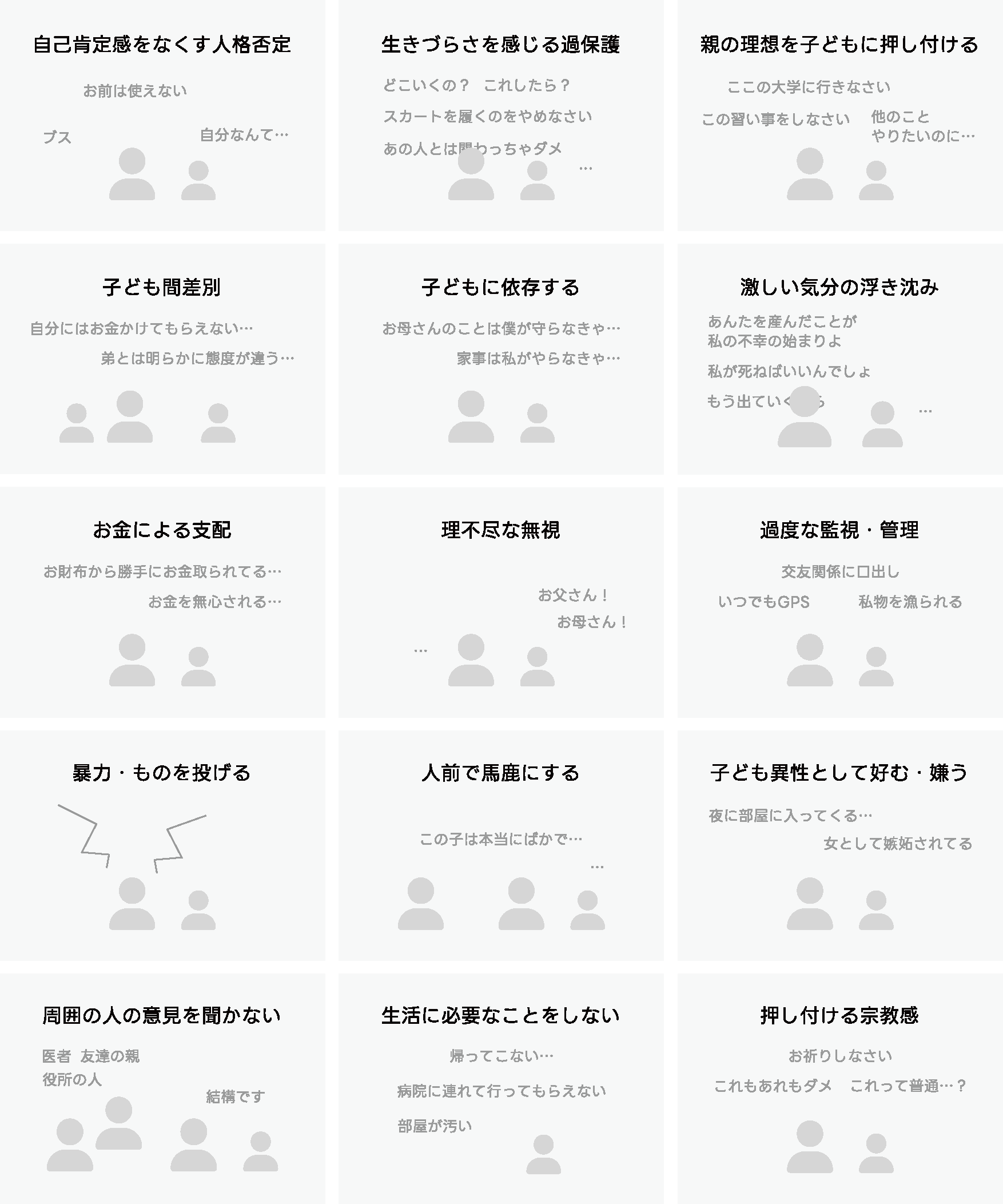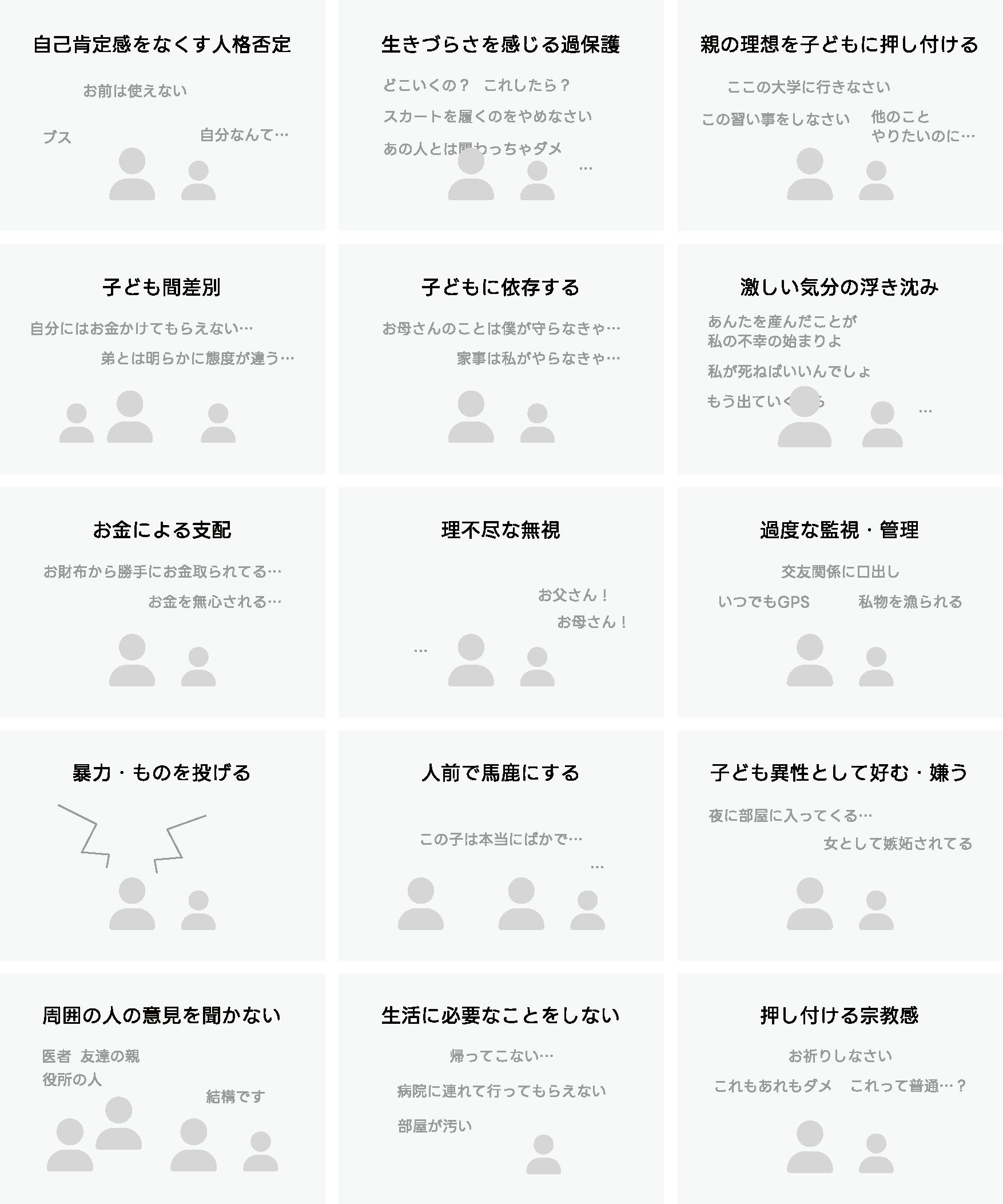 ※NPO法人第3の家族が80名以上の当事者の経験談を集積し、カウンセラーのアドバイスのもと作成した表です。わかりやすくするために示しましたが、問題の種類や大小は大切ではなく、「本人が傷ついているか」という主観を大切にしています。また、親が悪いというわけでもなく、労働環境のストレスや地域コミュニティの希薄化など、様々な社会的課題が起因してこれらの問題が発生しています。親へのアプローチを行う団体も多数あるため、第3の家族ではあえて少年少女に特化したサービスを提供しています。