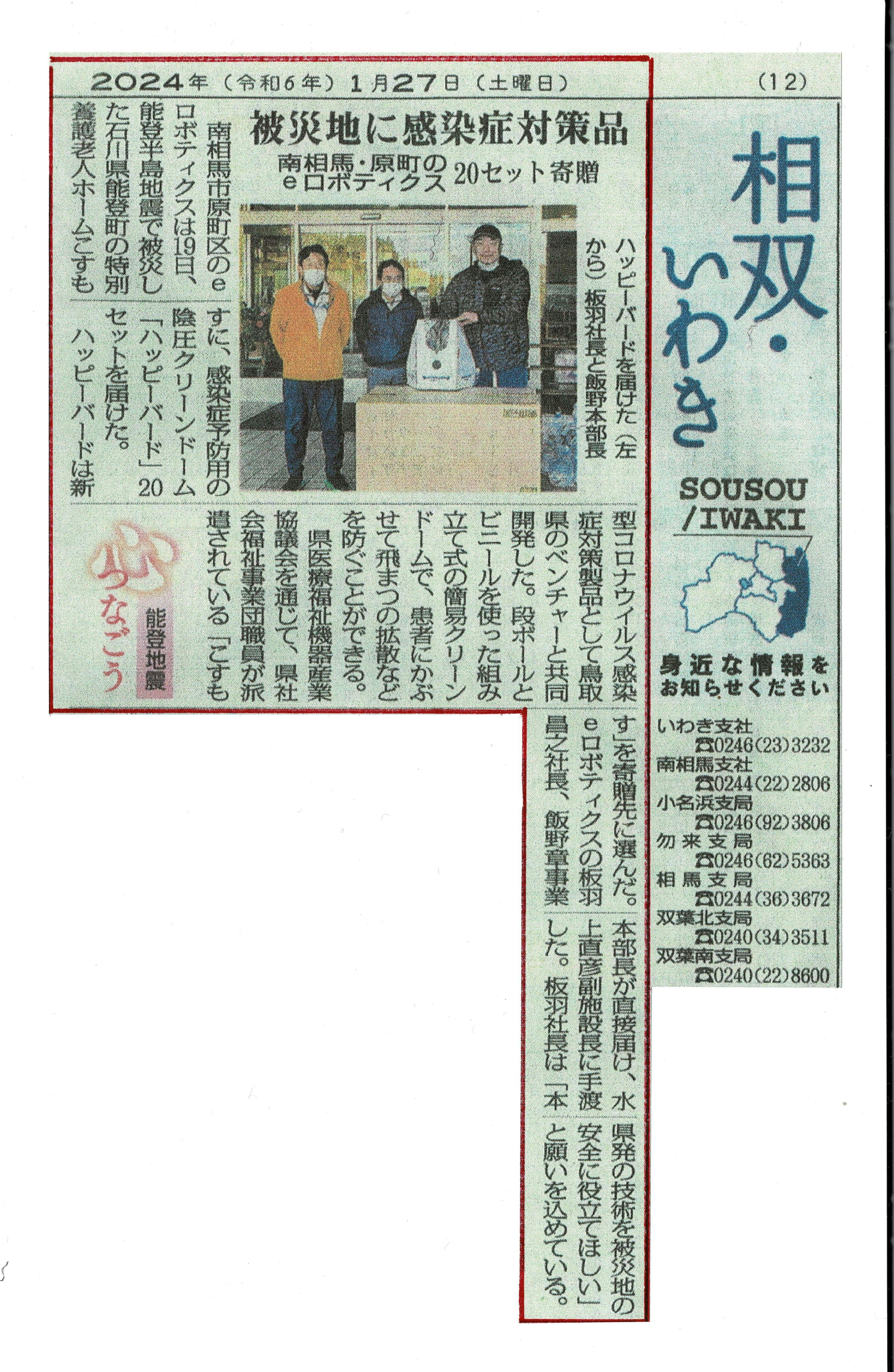 ◇2024年1月27日(土)福島民報新聞 被災地に感染症対策品 南相馬・原町のeロボティクス20セット寄贈