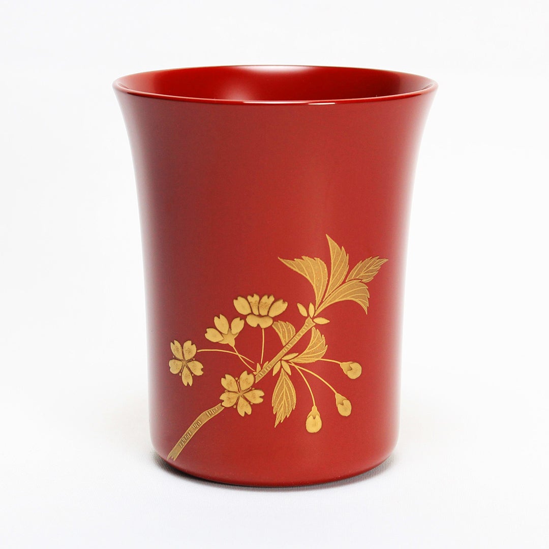こちらは「桜蒔絵マグカップ」です。このマグは最初はお客様への特注品としてお作りしたものですが、今では小社の人気商品のひとつとなりました。軽くて持ちやすく、少し反った飲み口は唇に優しく触れ、コーヒーやジュース、また焼酎やビールなどどんな飲みものも美味しくしてくれます。本朱塗りで仕上げ、一枝の桜を金の高蒔絵で描きました。