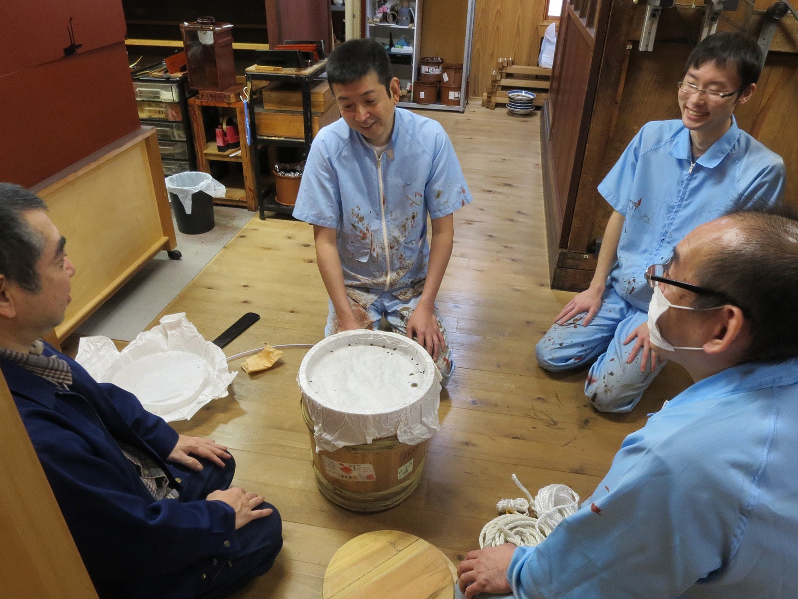 昨年秋、浄法寺から届いた日本産漆を前に笑顔の上塗師たち
