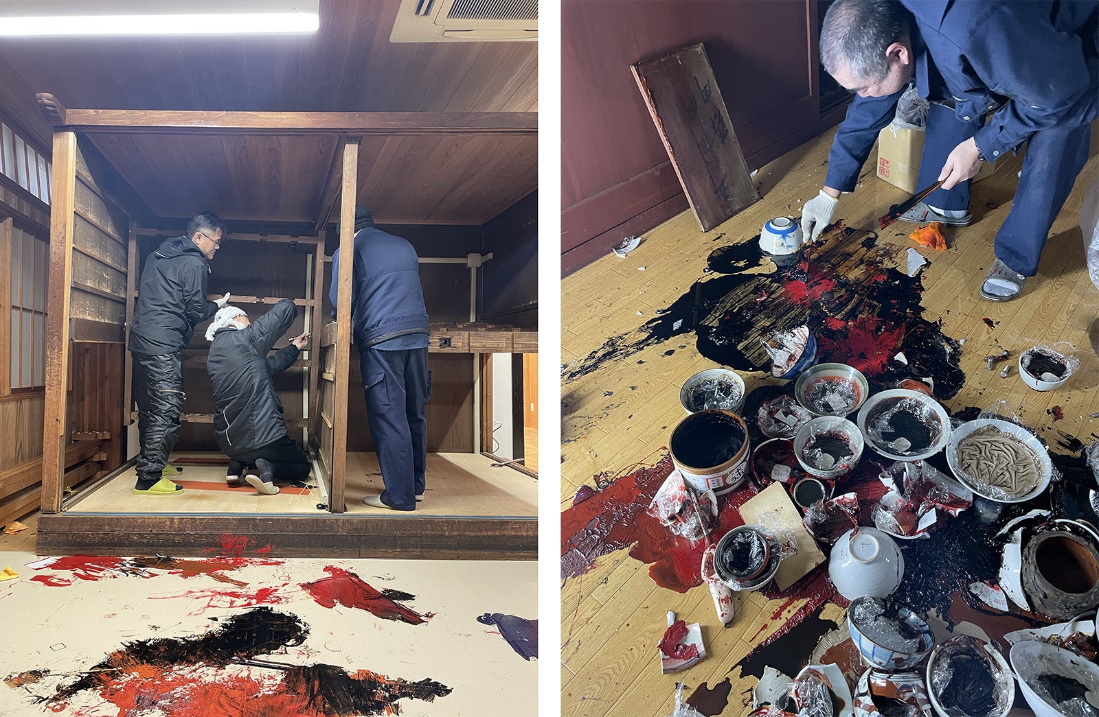 上塗室の復旧作業(破損した乾燥室の修理、漆が流れ出た床の掃除)