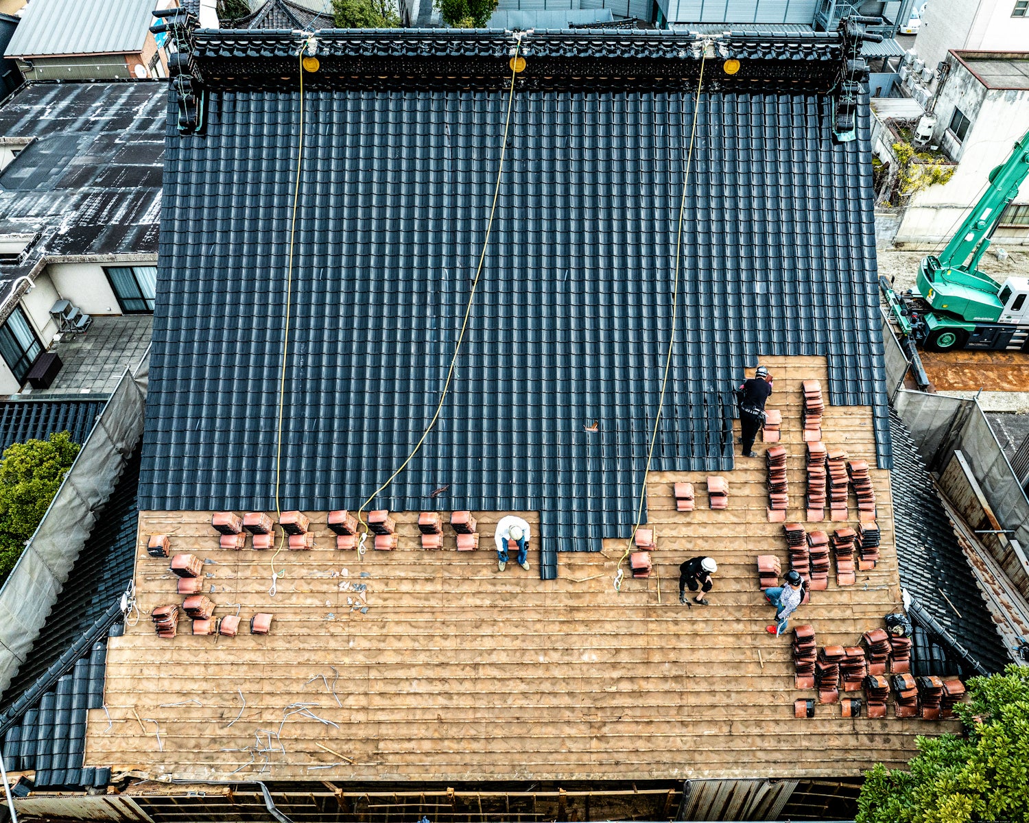 千場建設さんよりご提供いただいた瓦降ろしの作業風景です。近接している建物への被害を防ぐため一枚一枚職人さんが手作業で行いました。