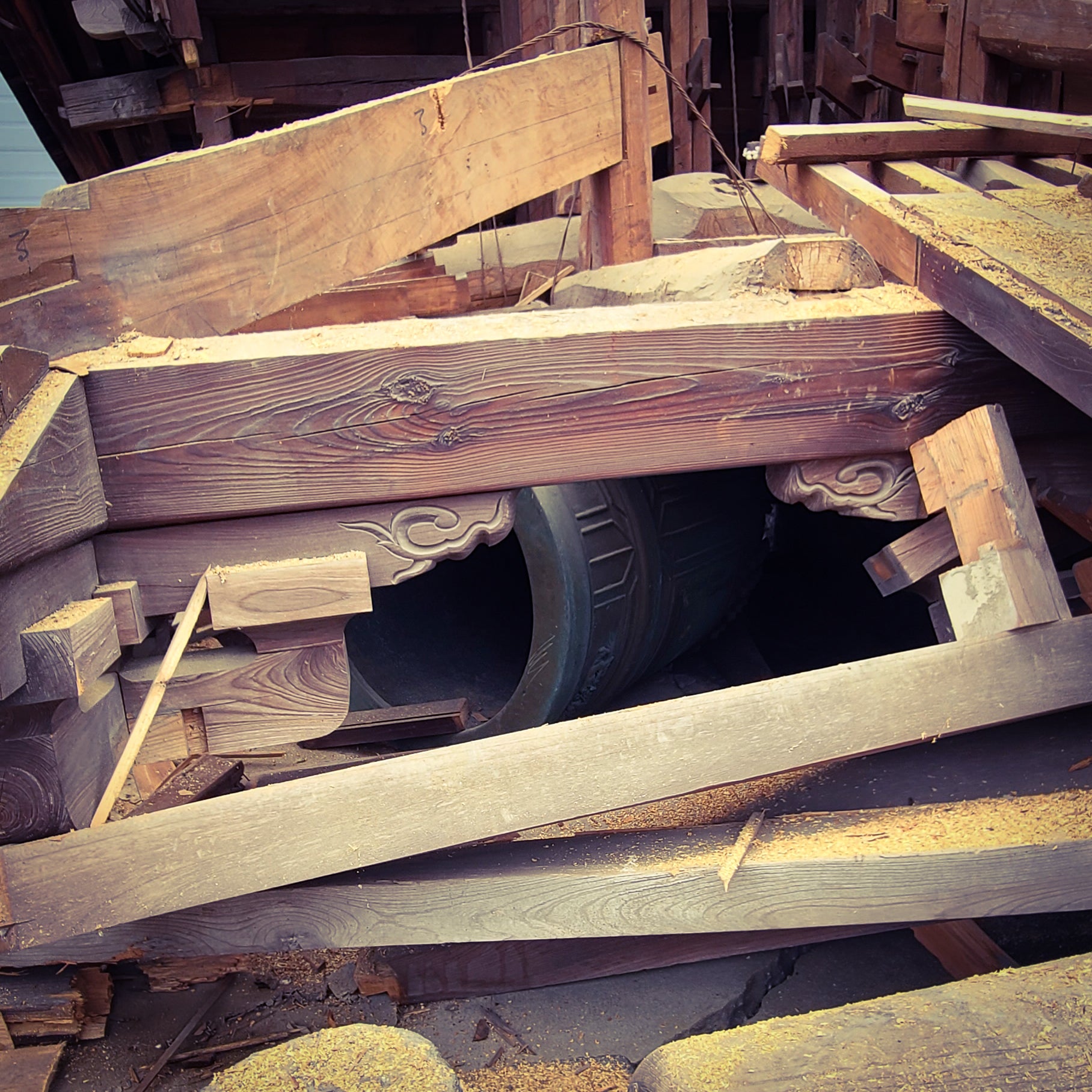 写真は午前の段階。安否が分からなかった大鐘が見えてきた状態です。地震発生時、天井の高さまで振られ地面に叩きつけられたため割れているのではないかと不安でした。
