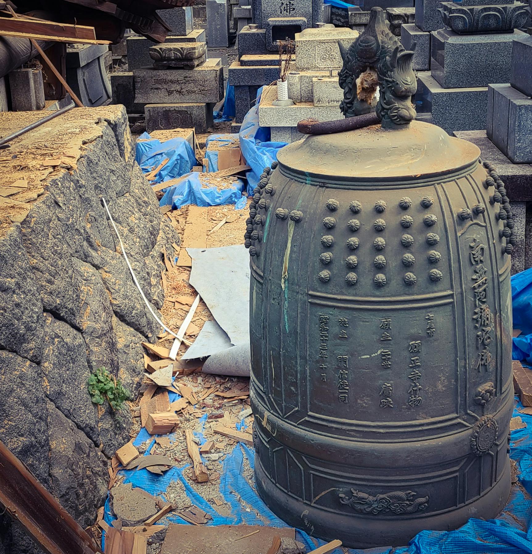 震災後、鐘楼堂の屋根に覆い隠される形だったため状態が分からなかった大鐘は傷こそ付きましたが無事でした。本当に嬉しかったです。当寺にとって今回の地震は失うものが多過ぎました。こうやって受け継がれてきた物の無事を確認する度に歓喜しております。