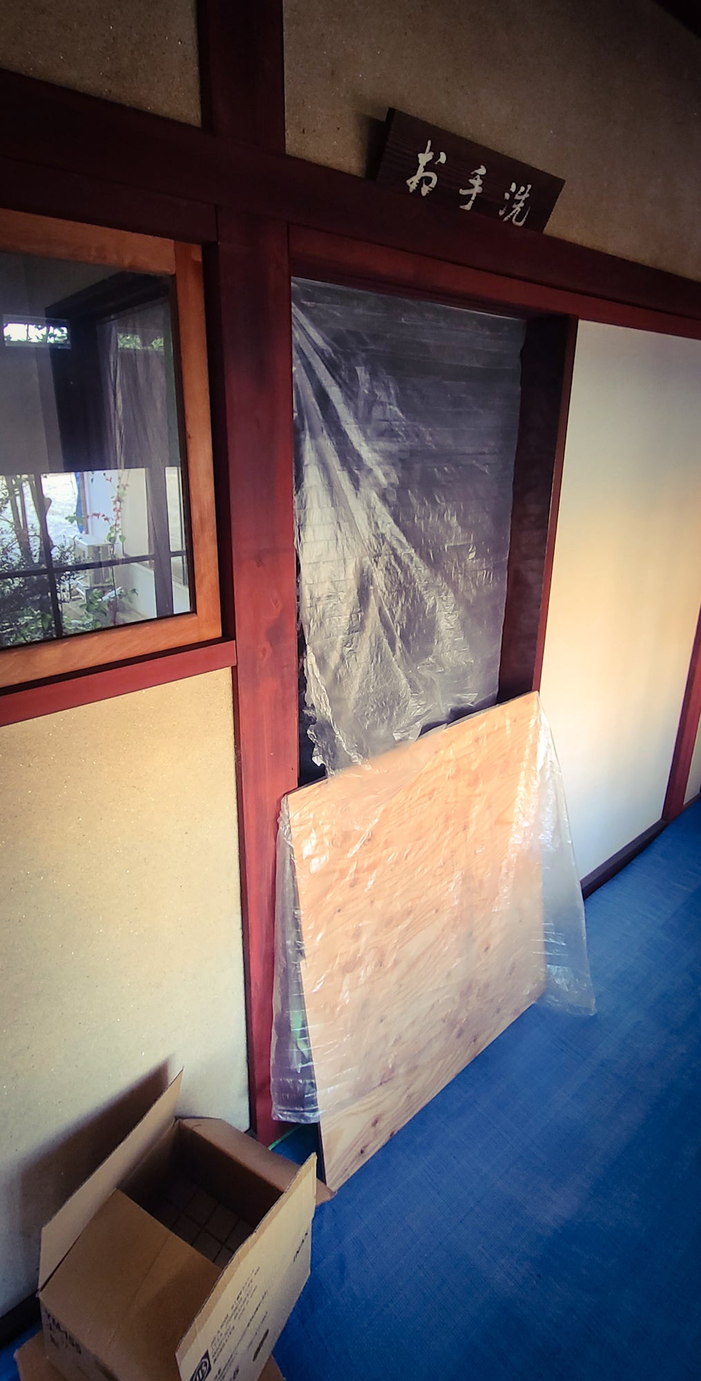 現在、当寺では皆さんに使っていただく御手洗を修繕しております。今回、本堂とともに皆さんに使っていただいていた御手洗も失いました。代わりに奥座敷に隣接する御手洗を皆さんに使用していただけるように整備しております。奥座敷御手洗は古く、和式のため足を悪くされた方には不便なものでした。本堂解体前に避難させた本堂御手洗の洋式便器を流用して和式から洋式にリフォームしております。