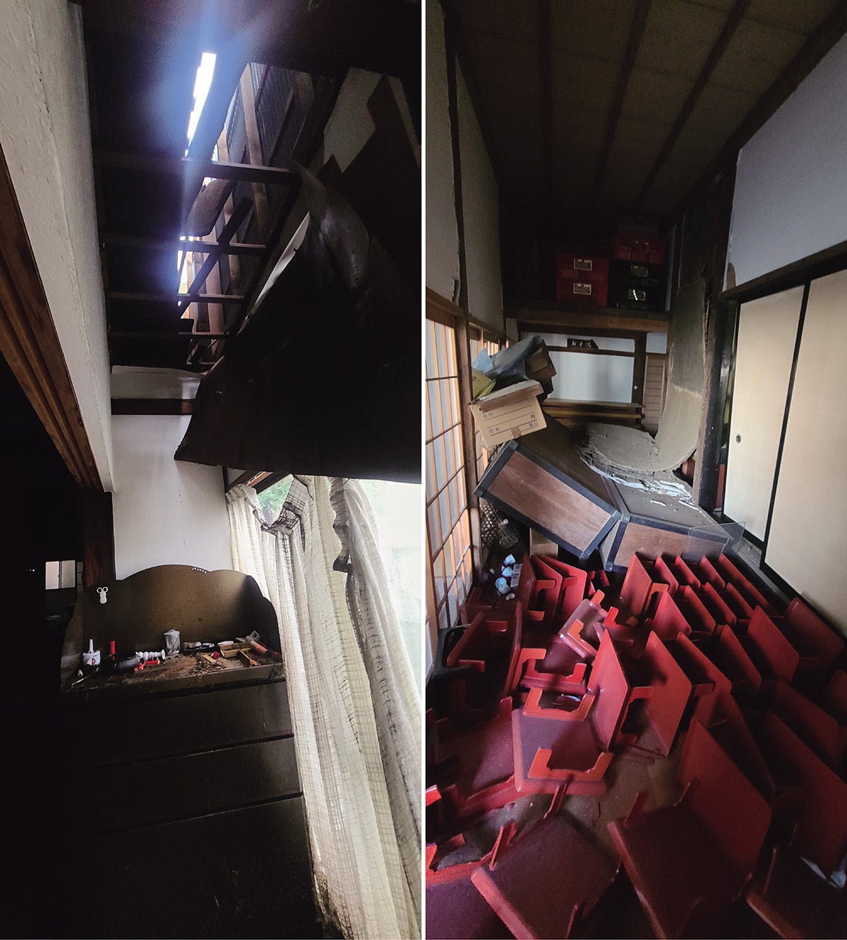 地震により大きく傾いた大屋根