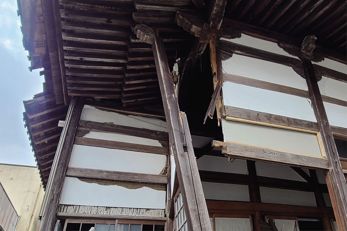能登半島地震にて被災した石川県七尾市の浄土真宗・真宗大谷派(総本山は東本願寺)の願正寺というお寺です。創建360年、本堂は文久元年建立、築163年の歴史を誇ります。今では珍しい聖徳太子を祀った太子堂を有します。今回の地震により鐘楼堂は全壊、本堂は大規模半壊(みなし倒壊)で解体せざるを得ない状況になってしまいました。専門家数名に相談するも倒壊の恐れがあり今後の余震や積雪に耐えれる確証がないと診断されました。二次被害を防ぐため、皆さんの拠り所となるお寺を再生するために解体に向けて動き出しています。