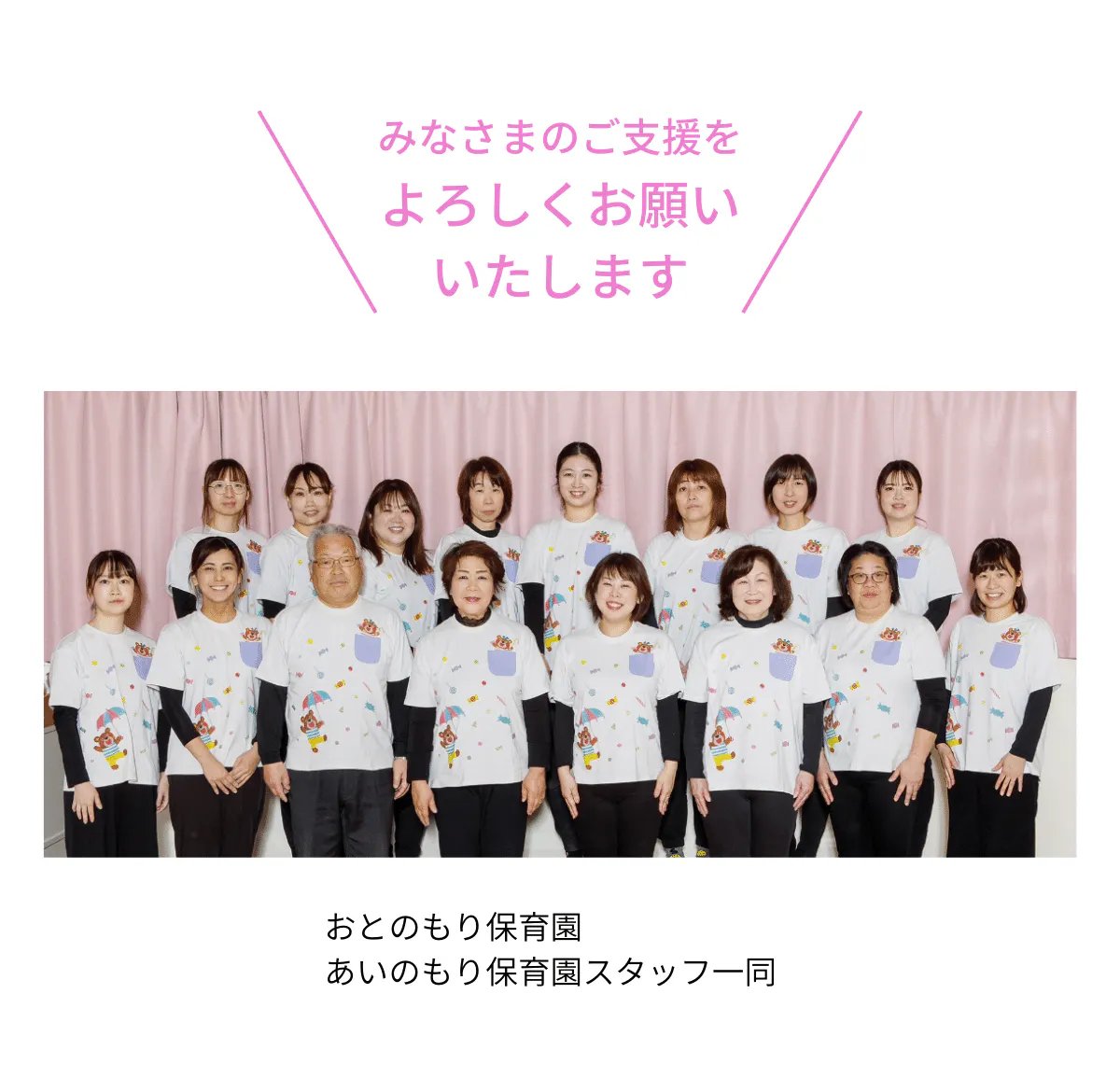 2024年6月、おとのもり保育園の分園としてスタートする「あいのもり保育園」そちらの創立記念誌に皆様のお名前を記名させていただきます。