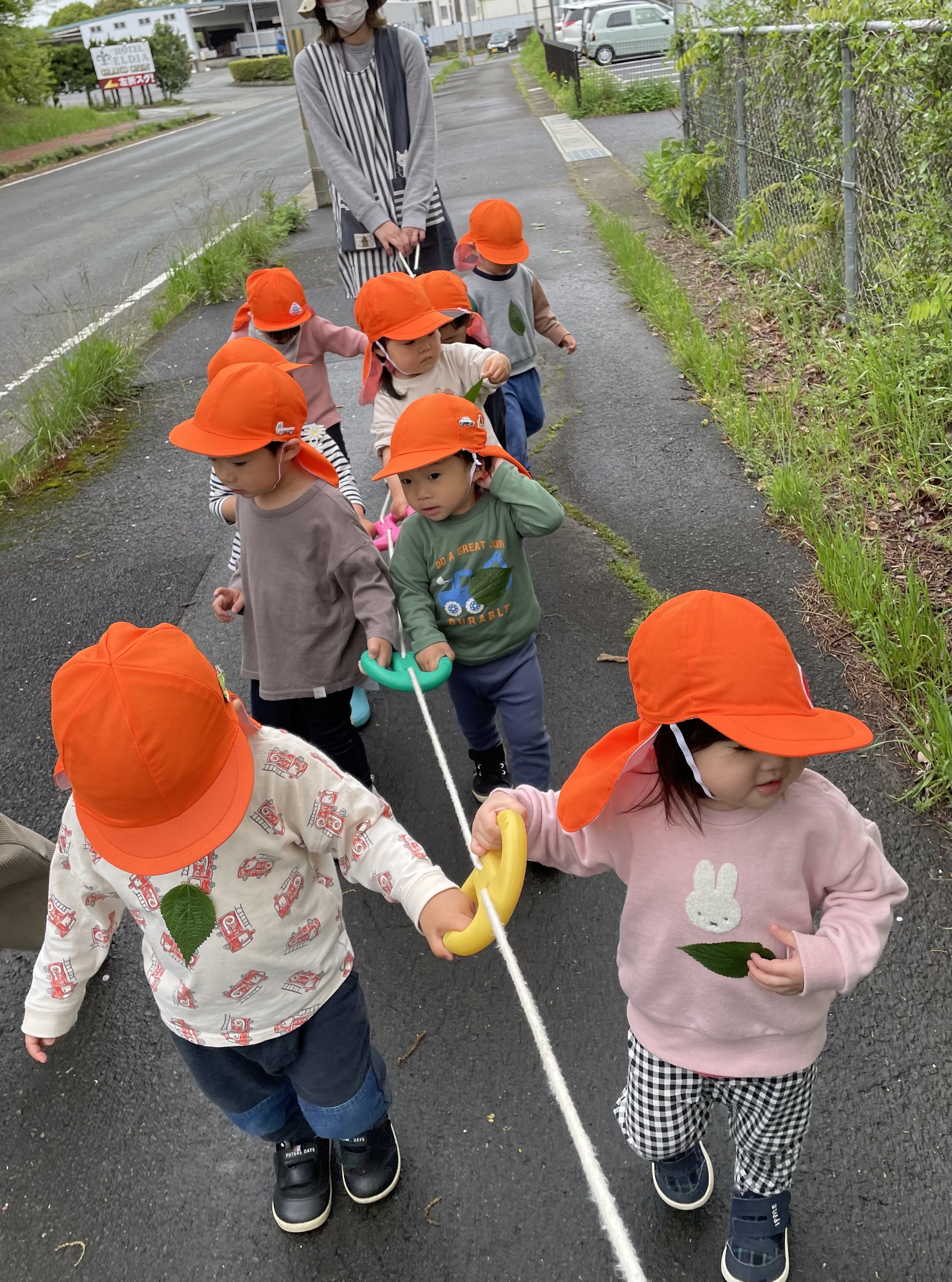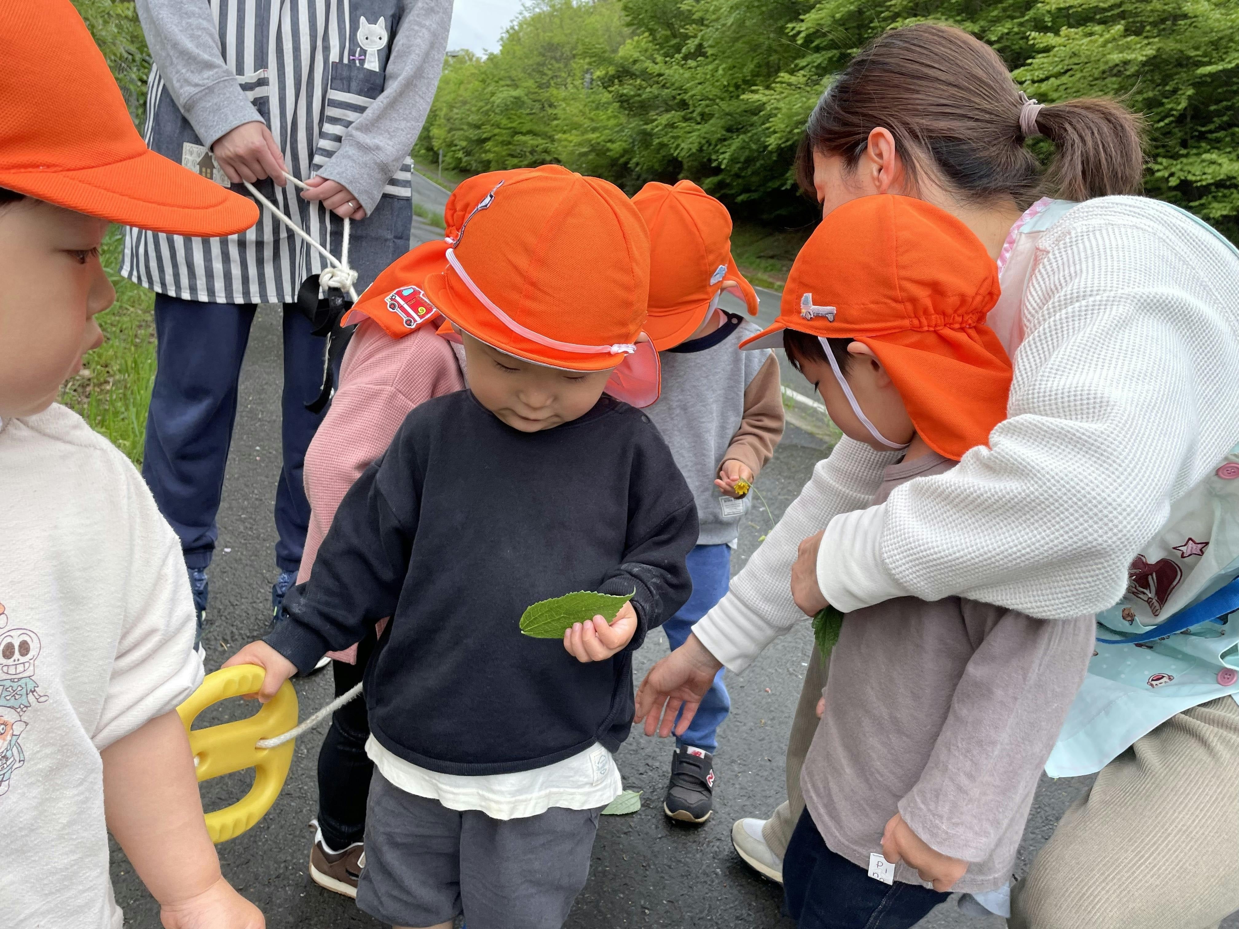子ども達に大人気の葉っぱを服につけてルンルンで歩きました。園まで大事に持って帰る子が多く、おうちの人へのお土産にしましたよ♪