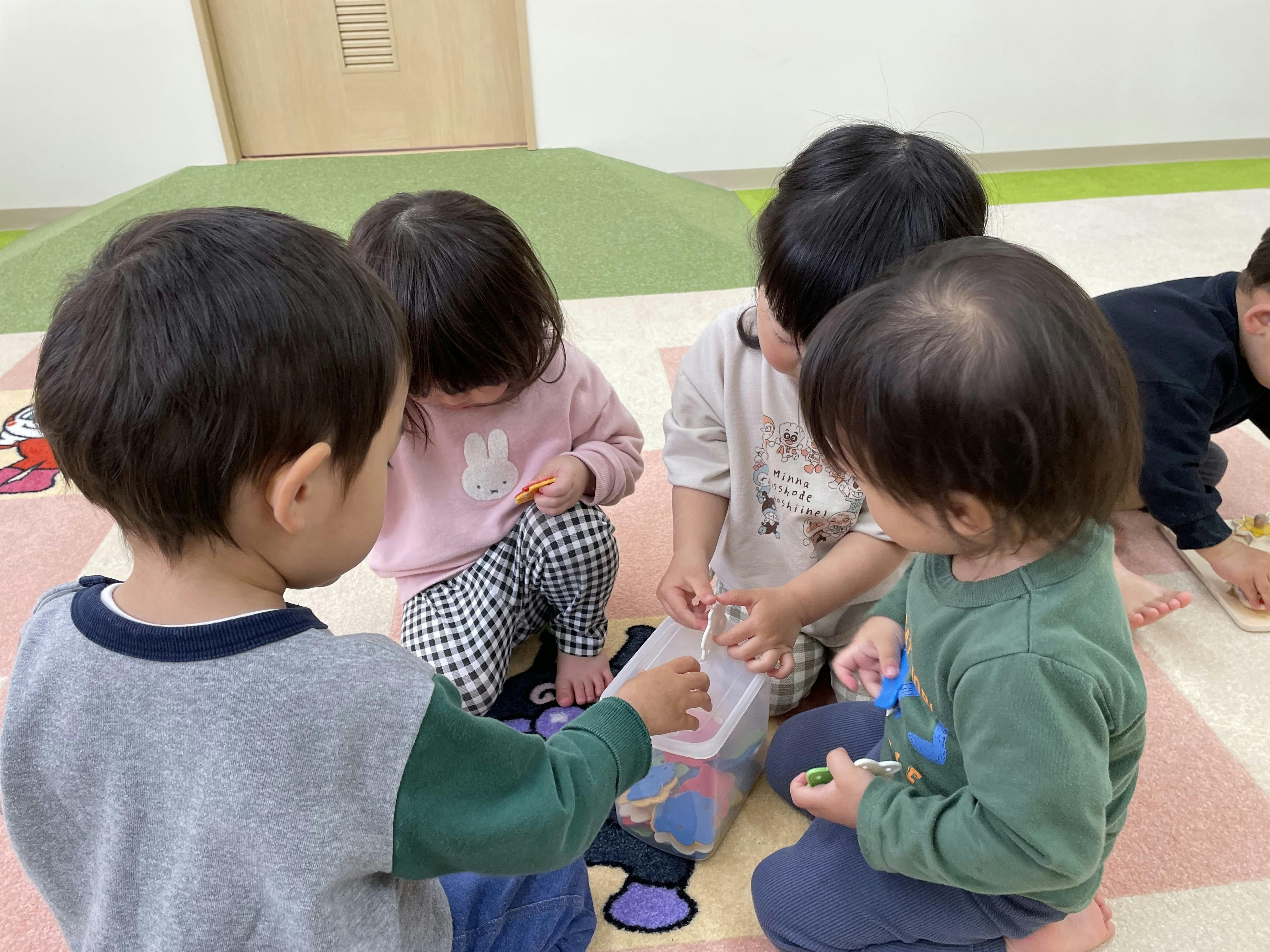 園に帰ってからは好きなおもちゃで遊びました。月齢に合わせた手作りおもちゃもあり、子ども達で仲良く遊んでいましたよ♪