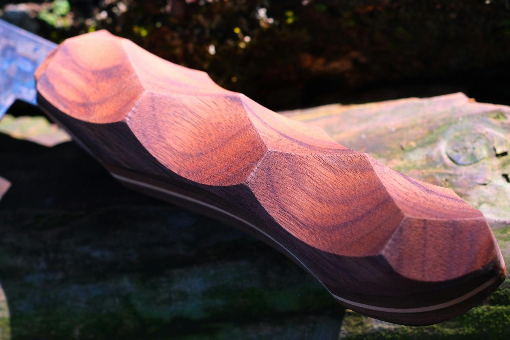 木の表面に削りをいれて凹凸をつける日本の伝統技法の名栗によりデザインされたハンドル部分。木種も世界三大銘木のウォールナットを使用し贅沢な仕様になっています。