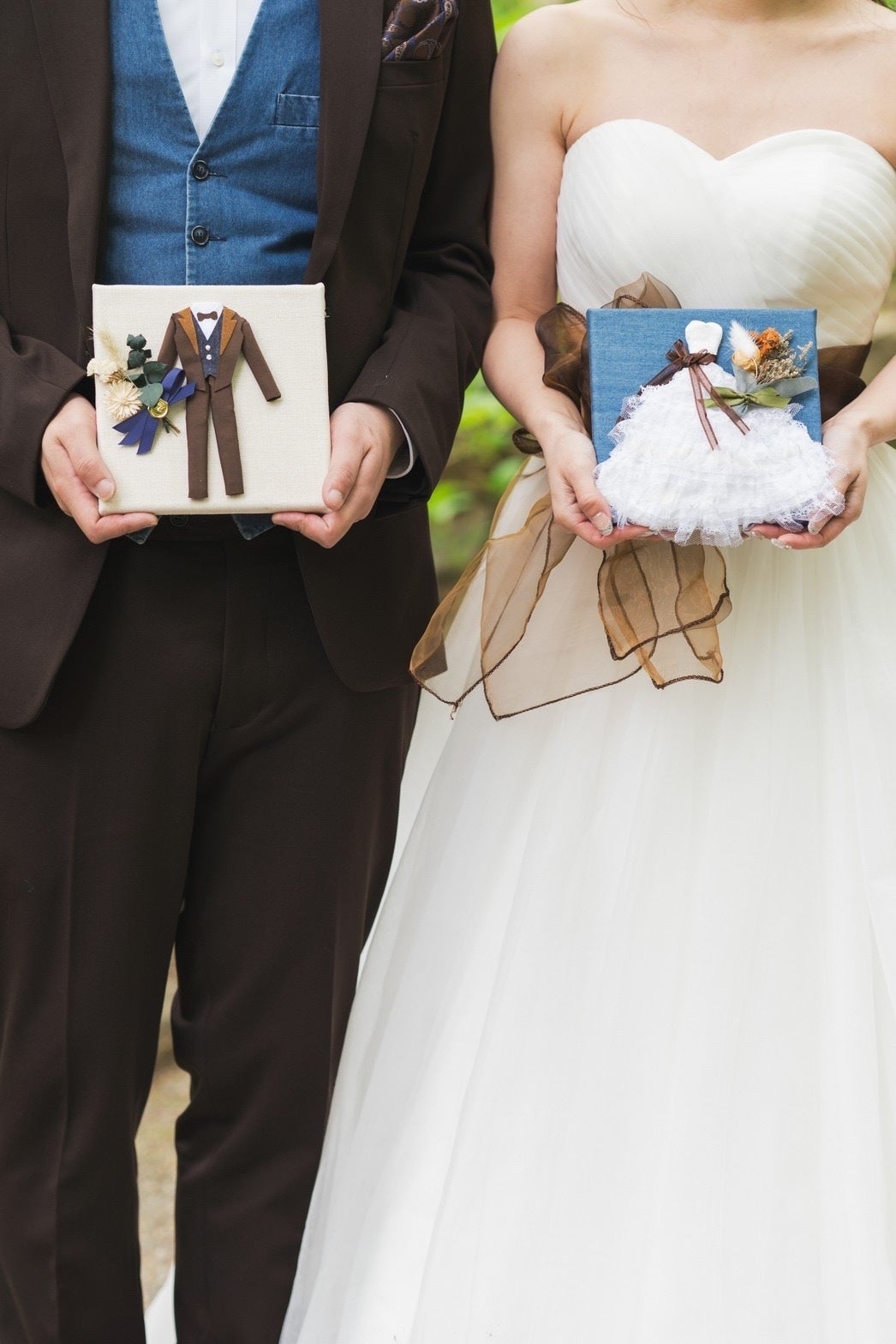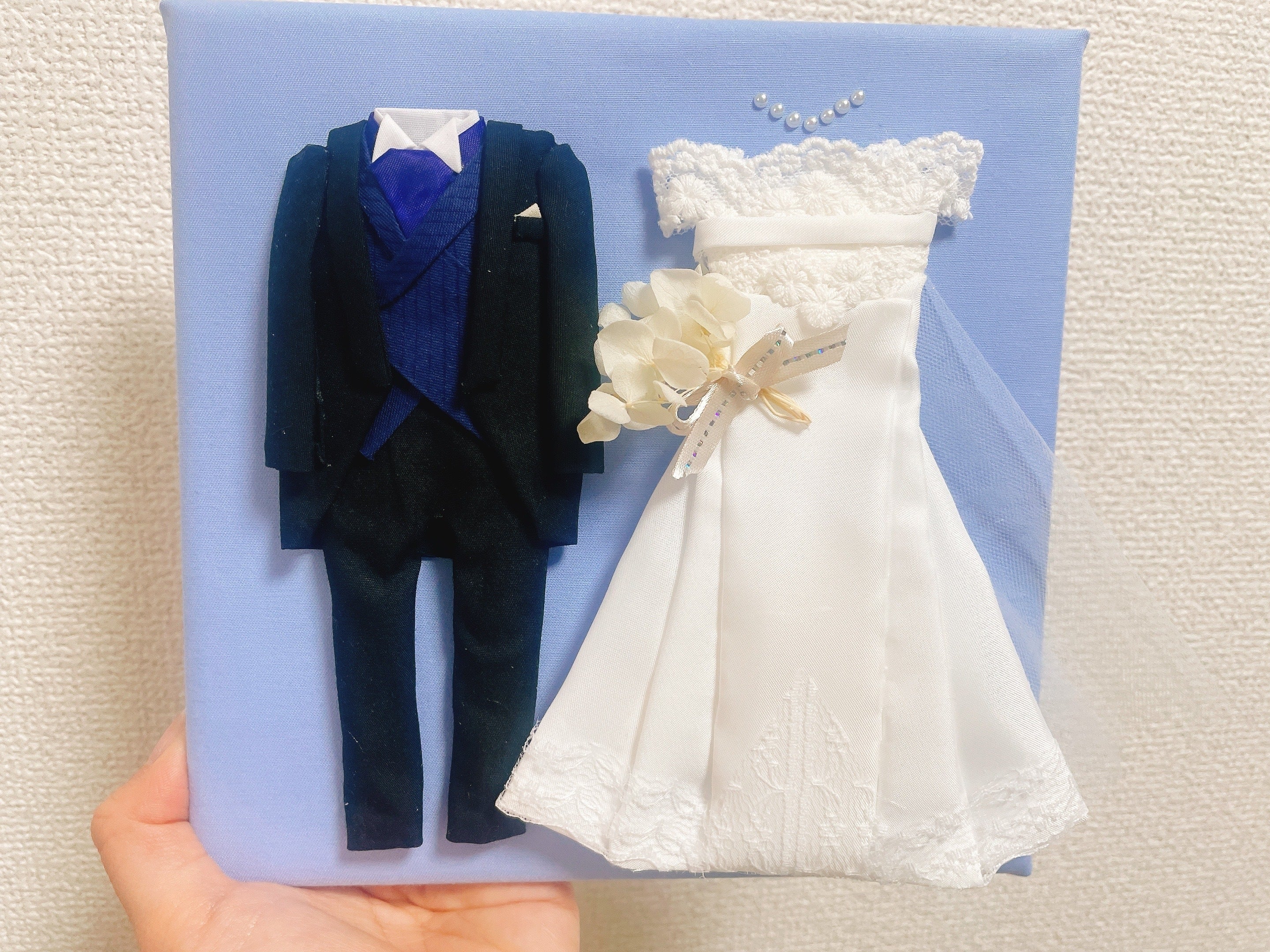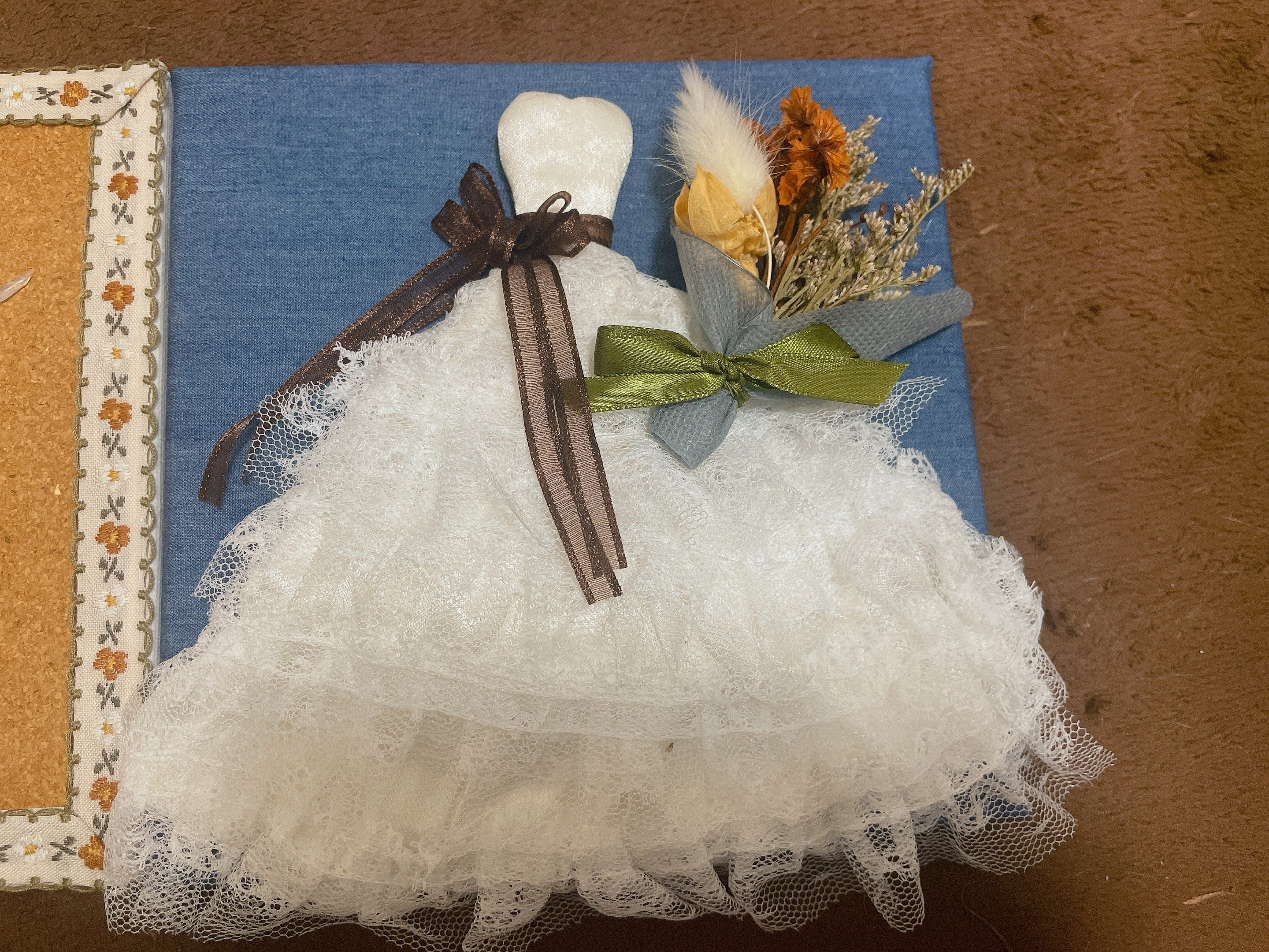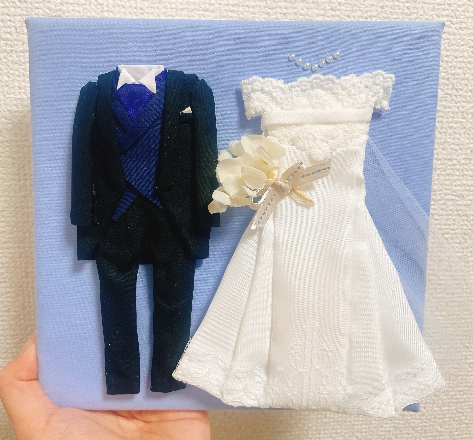 1年前フォトウェディングの撮影前に、何か形に残して自分の作品を一緒に撮影してもらいたいと思い、着用のドレスと新郎のタキシードを約50分の1サイズで作ってみました。