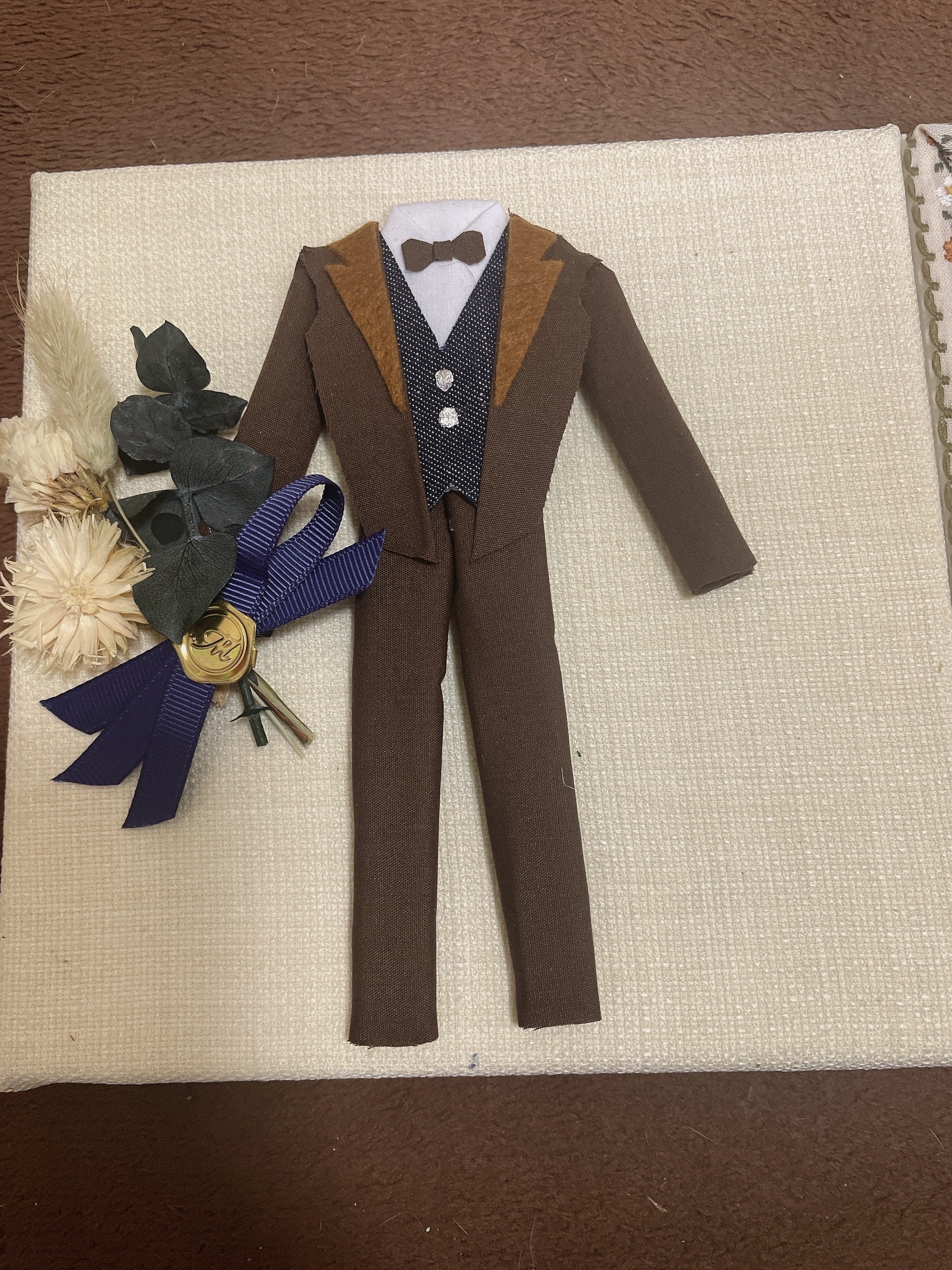 ・2500円→ミニチュア衣装を一つお作りいたします!(型紙の薄さの10〜15cm程のミニサイズ)オーダーではなくこちらでデザインを決めます。ドレス・タキシード・着物(男性or女性)の中からお選び下さい。お礼の手紙付き✉️