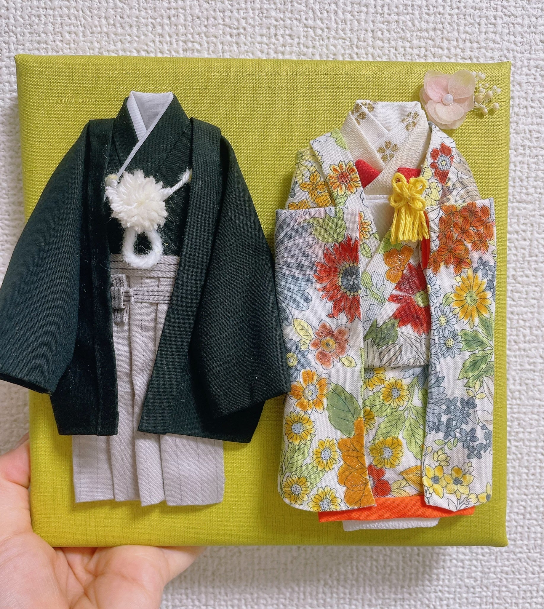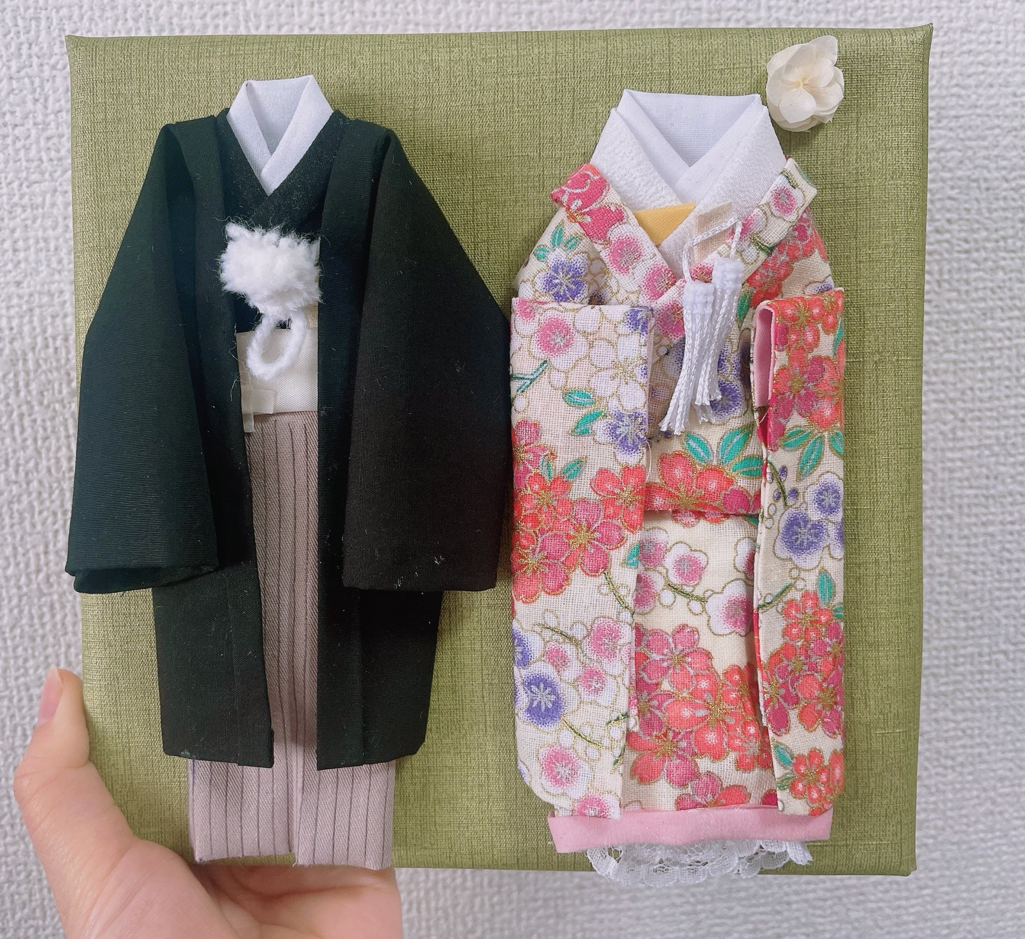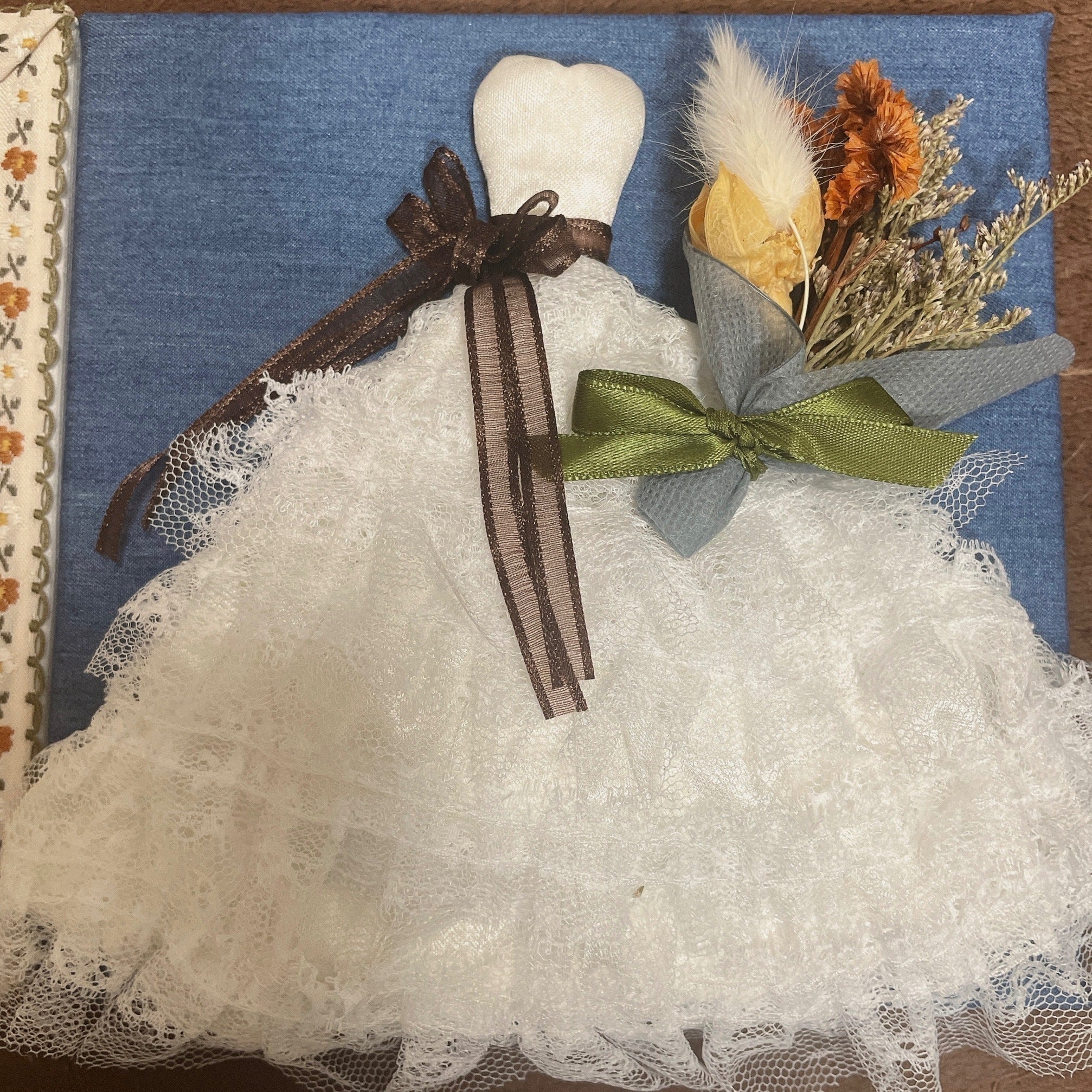 ・15000円→支援者様の思い出の衣装をオーダーメイドでお作りいたします!2つ衣装を並べた状態です(18cm正方形の張りキャンバス)  また、支援者様だけではなく、ご友人様(2組様まで)の分もお作りさせていただきます!  メールにてお写真(実際の衣装)を頂戴させていただきます。お礼の手紙付き✉️