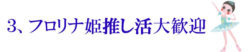 フロリナを大好きなダンサーは世界中数多くいます。YouTubeで「フロリナ姫」「フロリナ王女のバリエーション」等を検索すると、世界中のバレリーナがフロリナ姫を踊っている動画を観ることができます。とっても愛らしく美しいです。もちろん、ブルーバードもステキです!物語とは別にフロリナ姫の推し活、大歓迎です!!