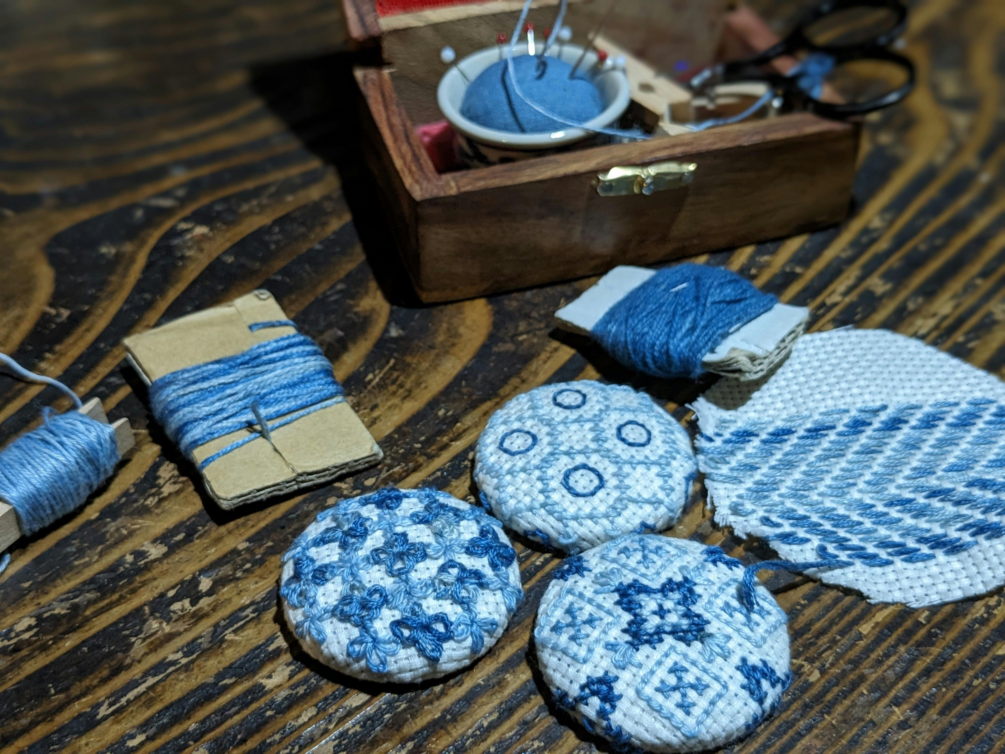 以前に染めた正藍染めのさしこ糸や刺繍糸を使って