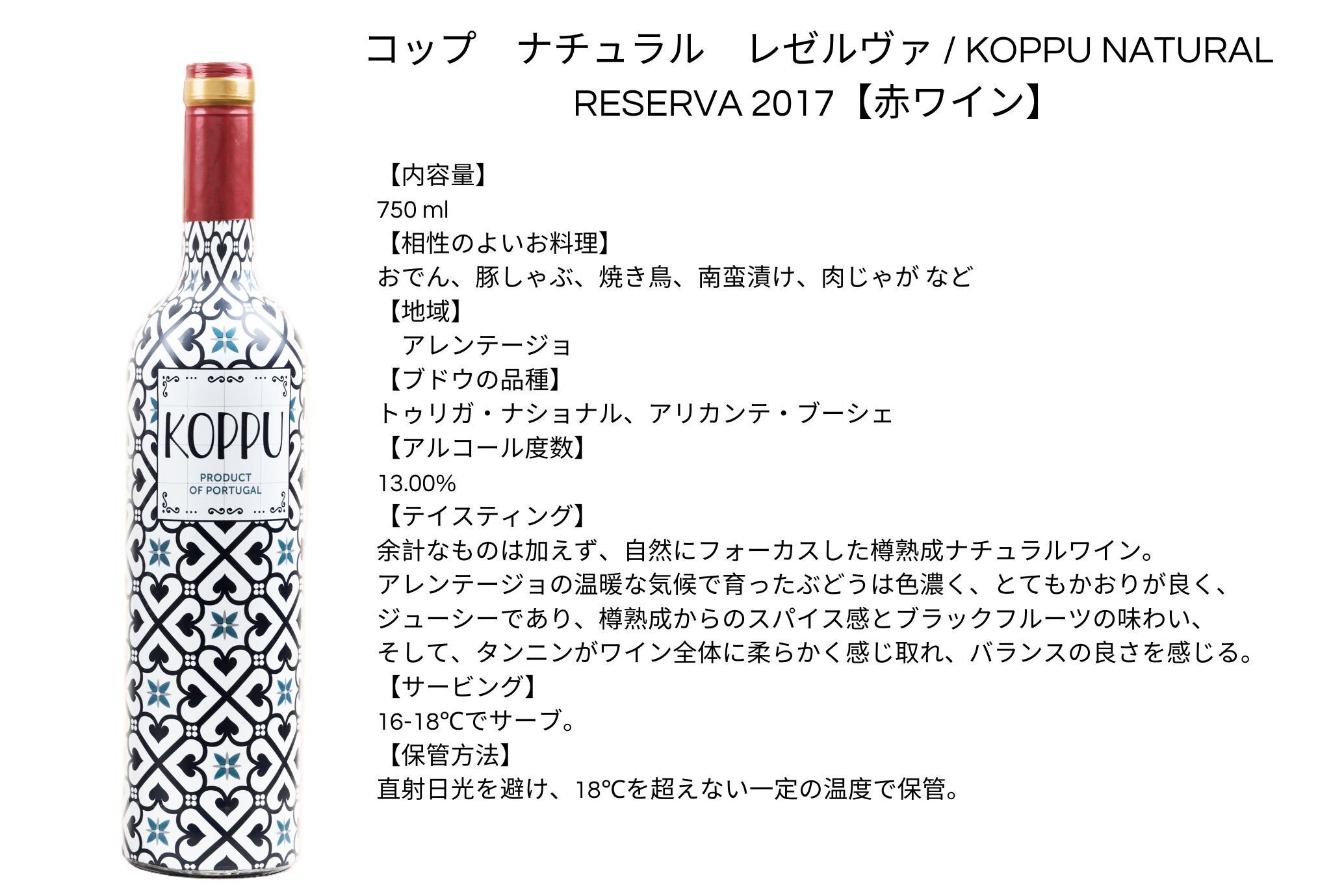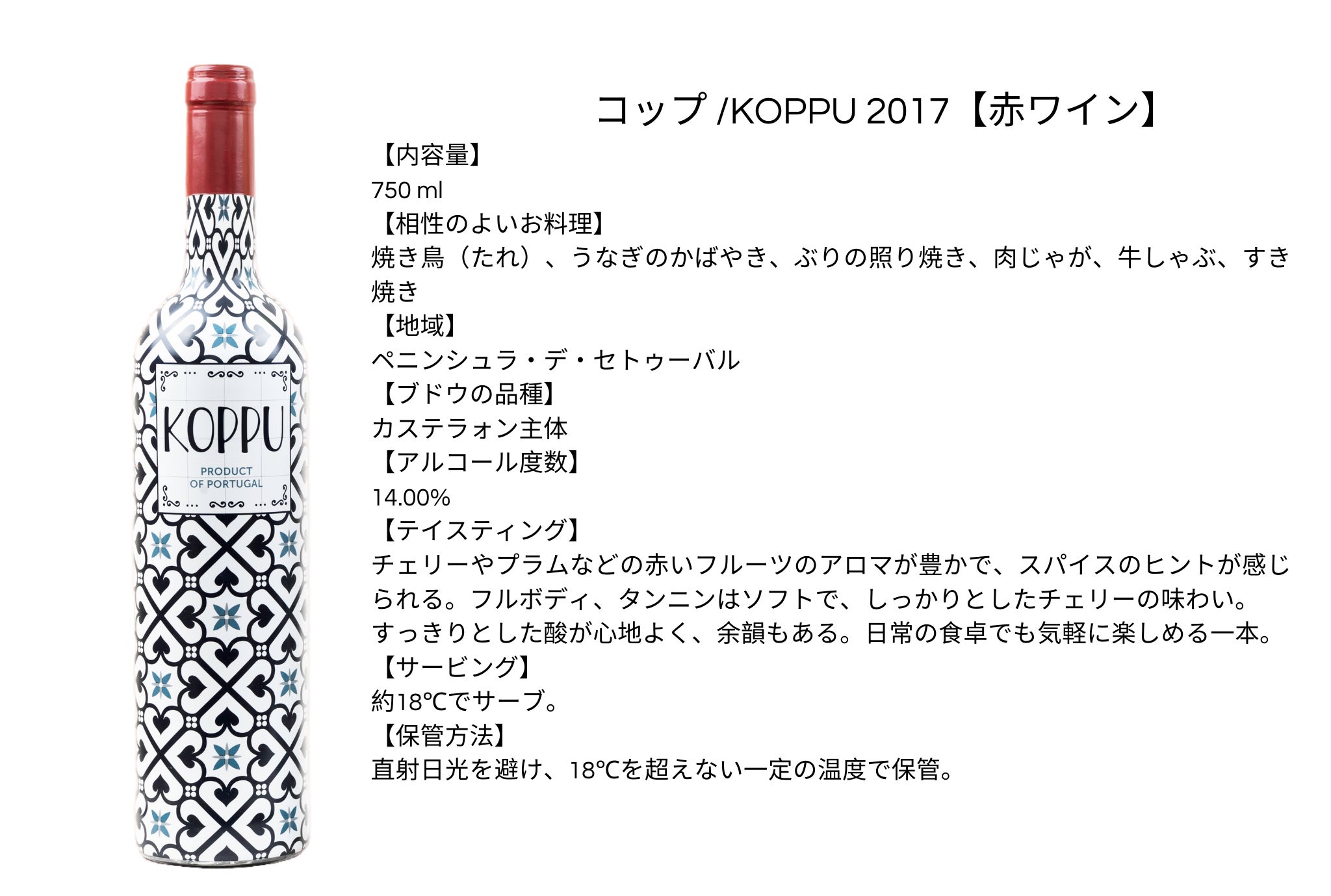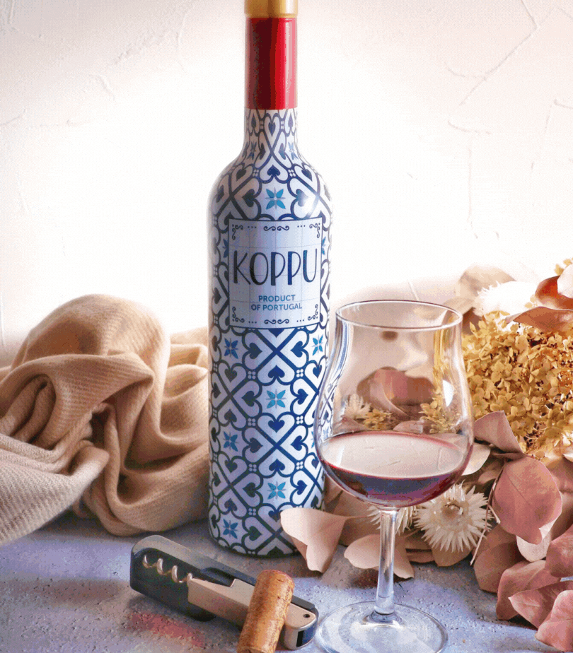そのボトルデザインはポルトガルの美しい伝統文化の”アズレージョ”をモチーフにし、ポルトガル語と日本語で同じ意味を持つ「コップ」を【KOPPU】で表記しています。現地では日常当たり前に飲むワイン。コップに注いで気軽に、どんな食事とも愉しめ洋食にも和食にも合わせやすい、自由な発想のポルトガル赤ワインです。