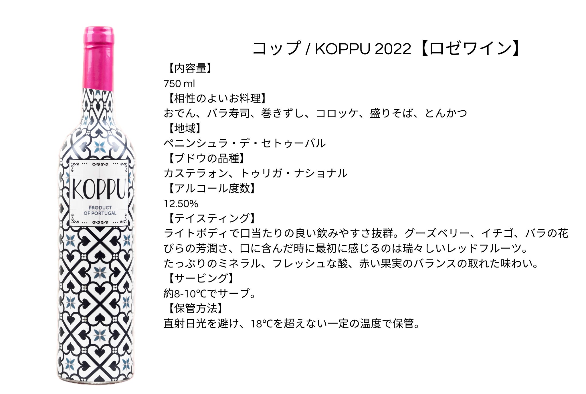 日常使いにふさわしいライトボディのKOPPUロゼは、ミネラルたっぷり、フルーティでフレッシュ、ポルトガルの潮風を感じさせる瑞々しさが最大の特徴。どんな食事とも相性が良く、マリアージュに困った時にはこのロゼワインを。食事なしでも飲みやすい爽やかさがあり、これから近づく桜の季節には、花見のお供にも最適です。