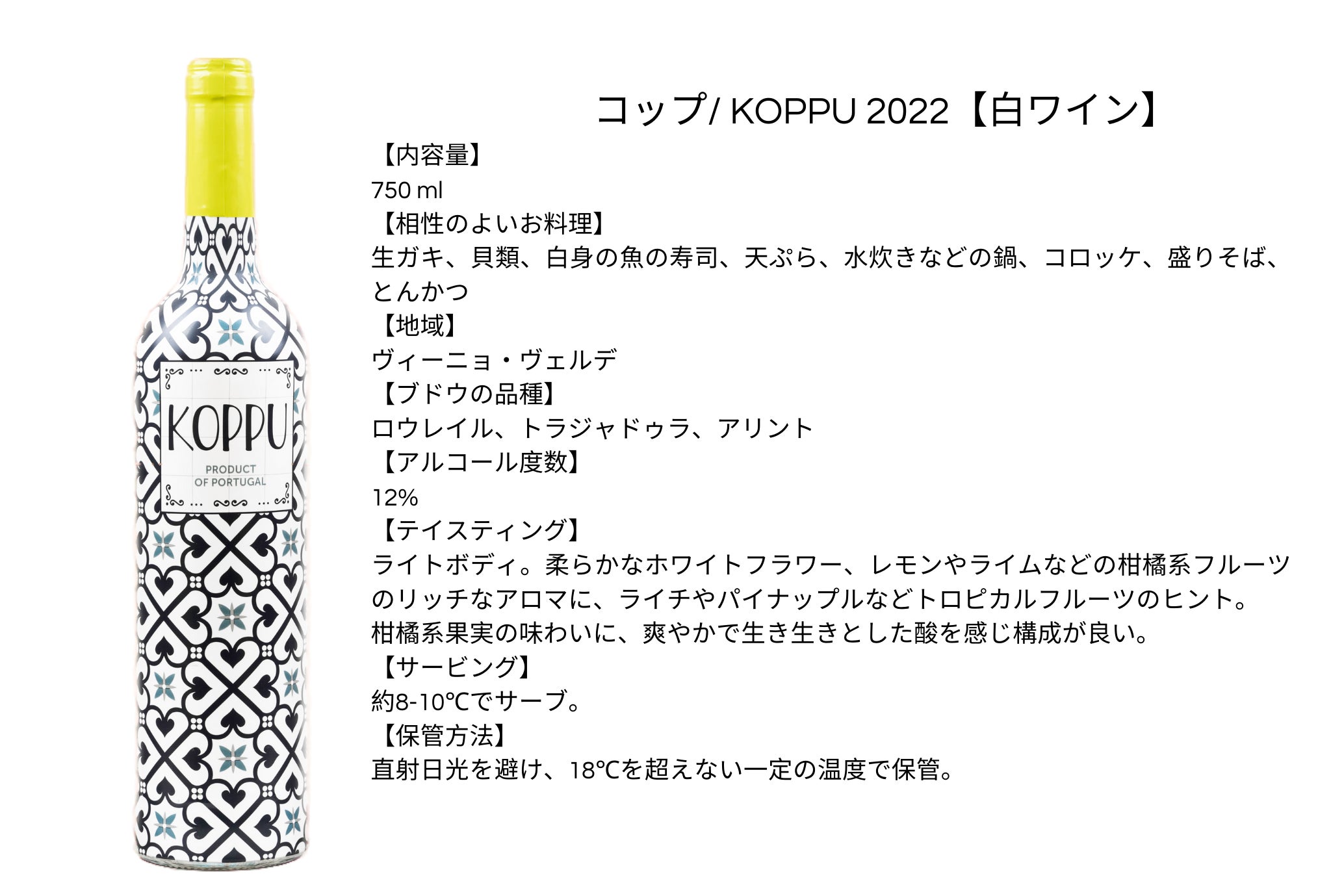 KOPPU白に使用されているのは、ヴィーニョ・ヴェルデ地方で昔から栽培されてきたブドウ品種、ロウレイロ、 トラジャドゥラ 、アリントなど。ライトボディで柔らかなホワイトフラワーのアロマに、ライチやパイナップルなどトロピカルフルーツが感じられます。レモンやライムなどシトラス系のさわやかな酸味に、これから暖かくなる季節にぴったりのフレッシュさとミネラル感が特徴で、バランスの取れたクオリティの高さと、色々な食事に合わせやすい柔軟さを兼ね備えています。