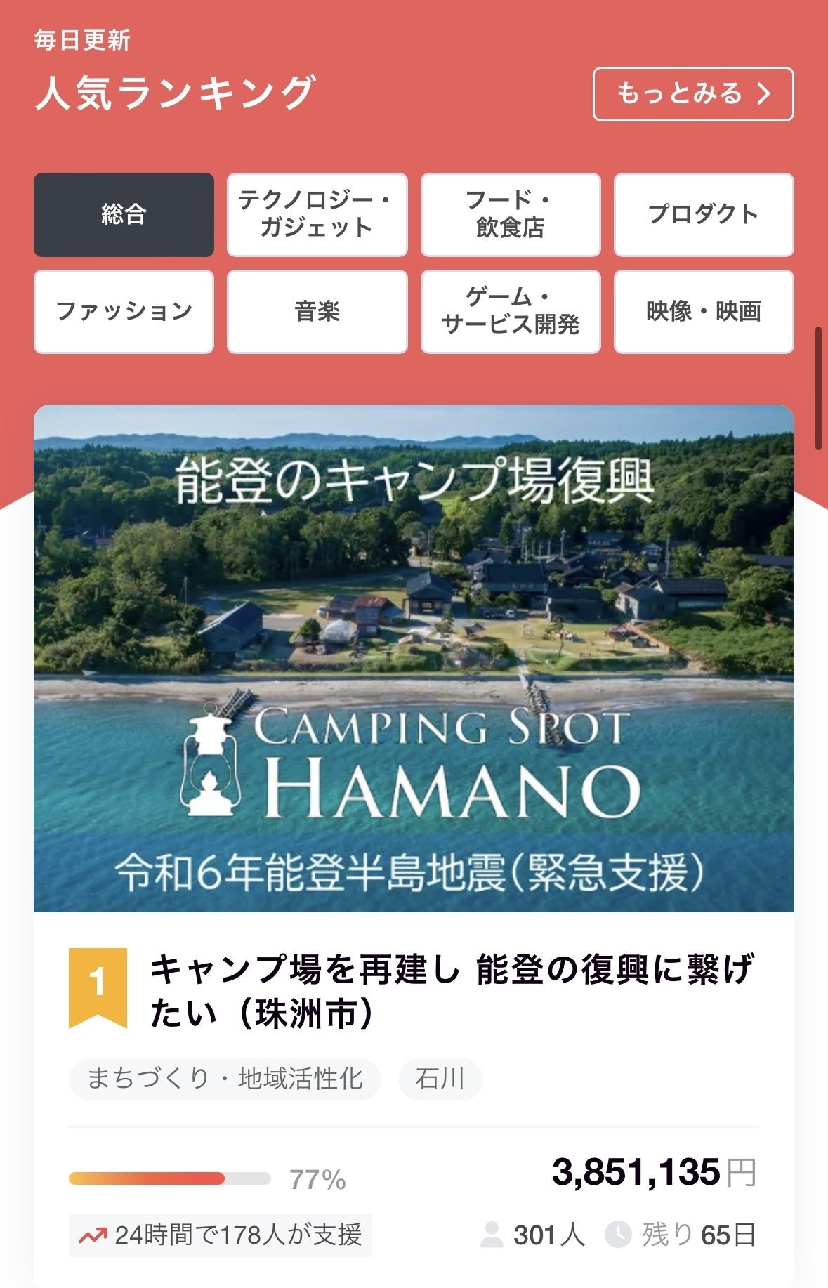 現在CAMPFIREの人気ランキングで総合1位になっています。