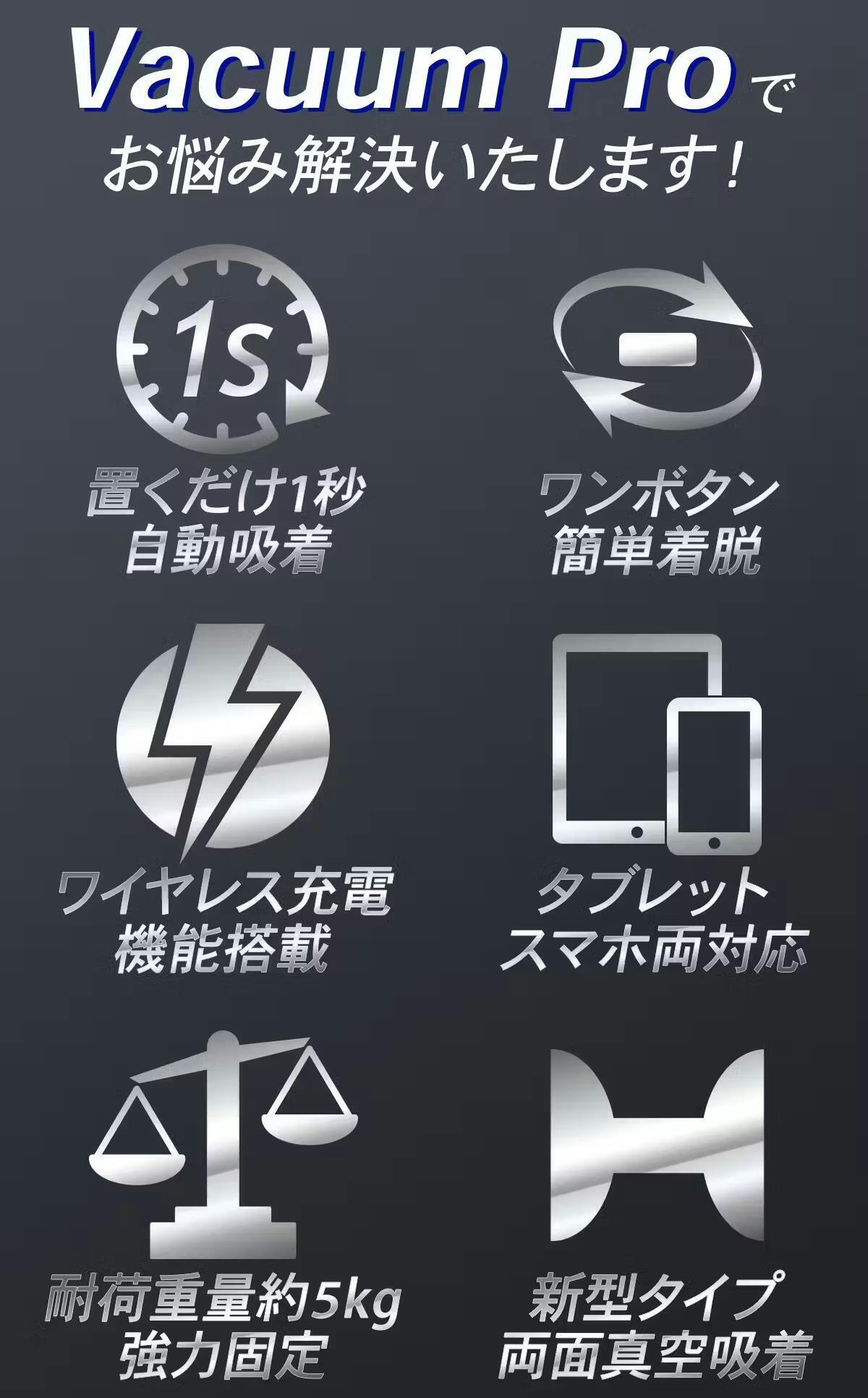 Vacuum Proはワイヤレス充電対応の真空吸着式スマホホルダーです。この製品は、スマートフォンを自動的に固定し、ワイヤレス充電機能も備えています。では、詳しく見ていきましょう。