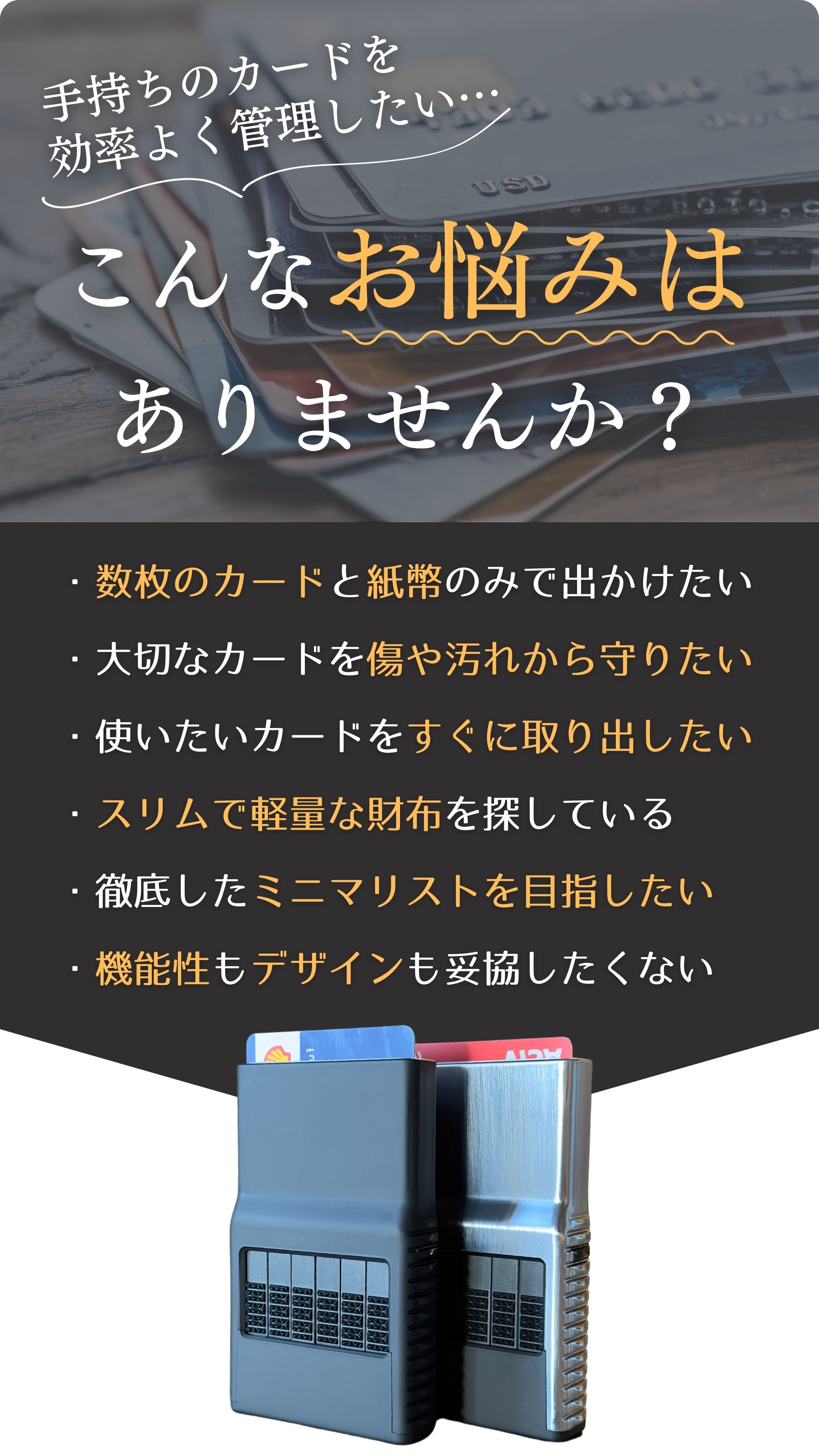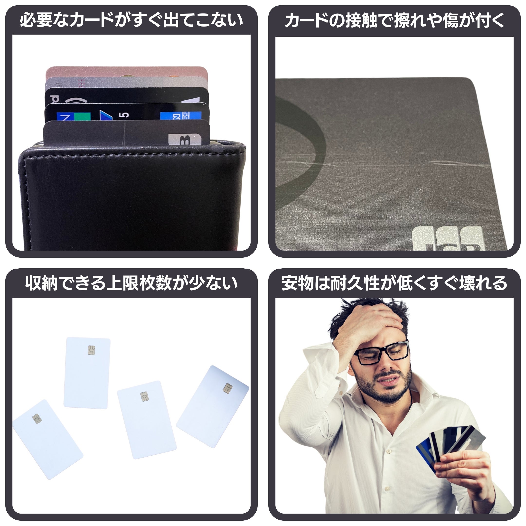 ほとんどのカードウォレットが「カードを破損させる」また「目当てのカードが選びにくい」という状況になっているのです。