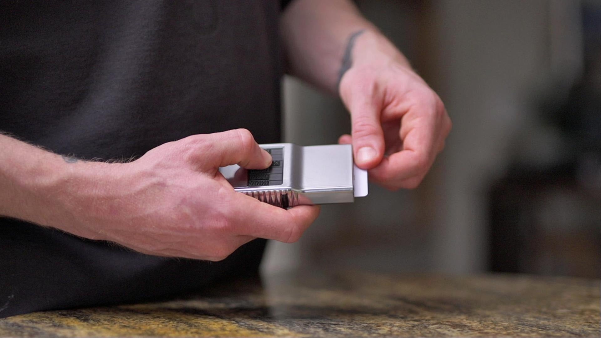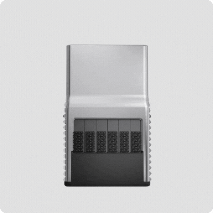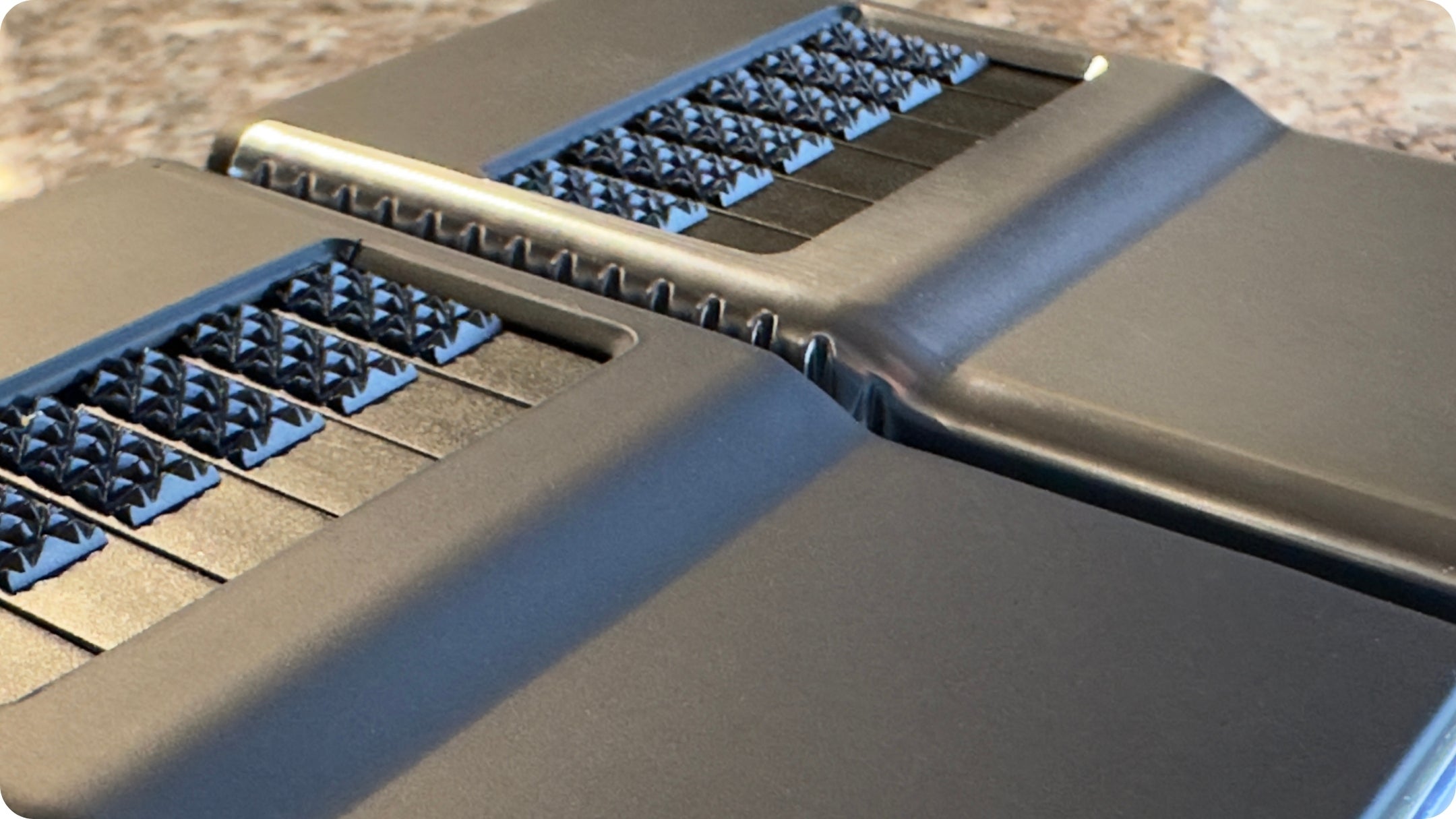 親指で操作をしやすい様に「シャーク・トゥース・グリップ」を採用しています。このギザギザが交互に配置された特殊なグリップは、非常に滑りにくく快適な操作感でカードをスライド排出することが可能です。